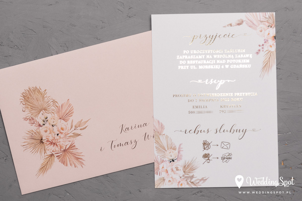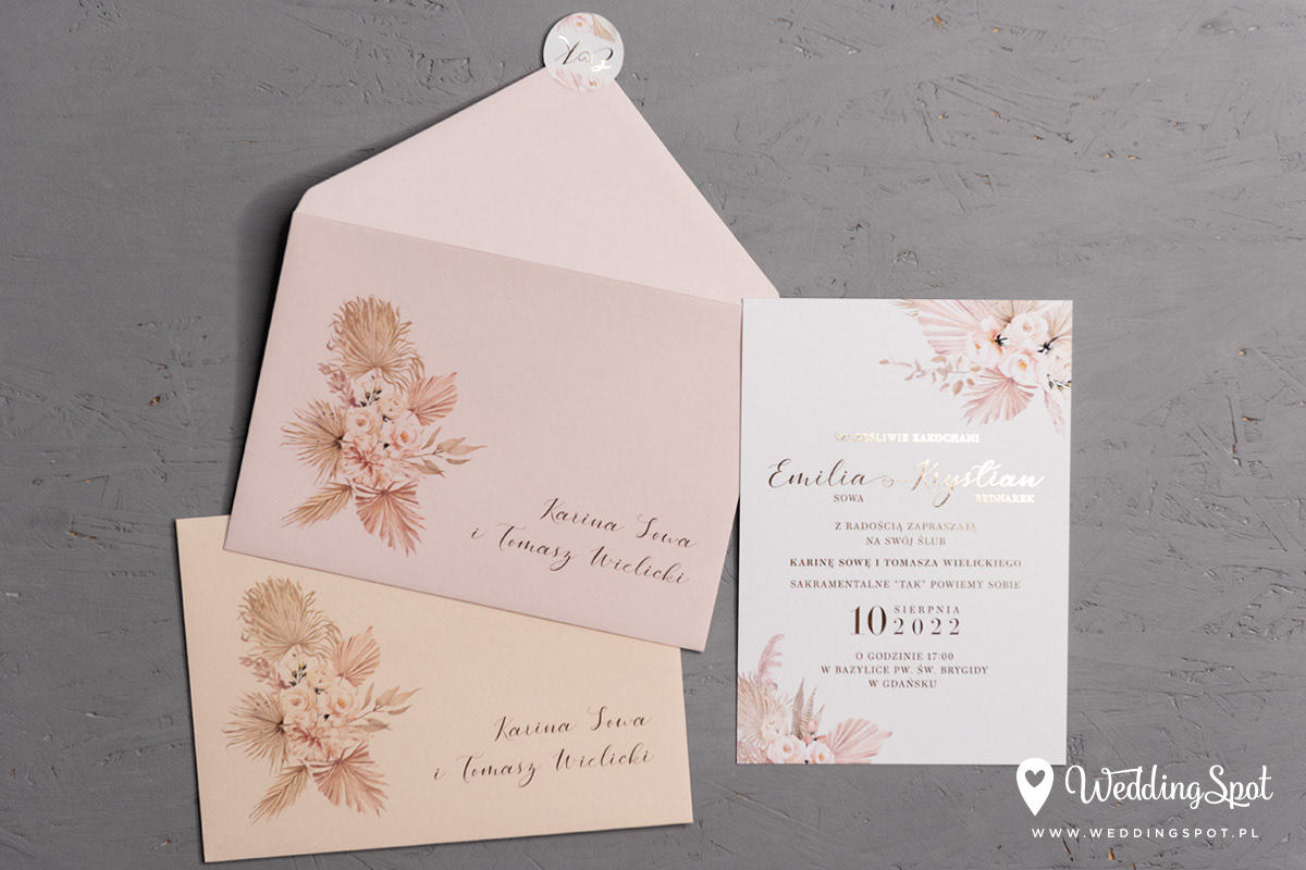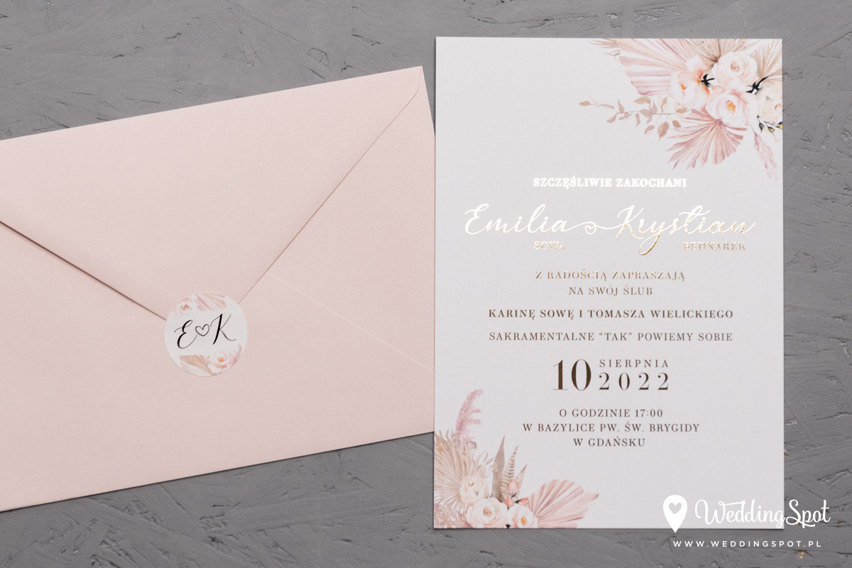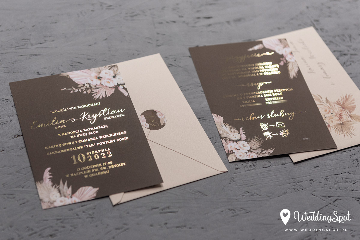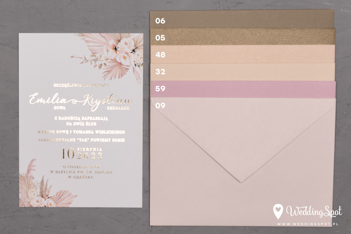 6,90 zł (od 176 szt.) 7,30 zł (101-175 szt.) 7,50 zł (76-100 szt.) 7,60 zł (50-75 szt.) W cenie: zaproszenie, koperta w wybranym kolorze, personalizacja nazwisk na zaproszeniach Opłata za wykonanie uszlachetnienia (niezależnie od ilości sztuk): 200 zł Złocona naklejka na kopertę: od 0,80 zł Personalizacja koperty: 2 zł Wymiary zaproszenia: 11 x 15,4 cm Papier: biały matowy, gramatura 300 g/m2 Uszlachetnienie: obustronne złocenie, obustronna folia soft touch Istnieje możliwość modyfikacji wzoru oraz przesłania własnego tekstu do zaproszenia. Minimalne zamówienie: 50 sztuk Czas realizacji: do 10 dni roboczych