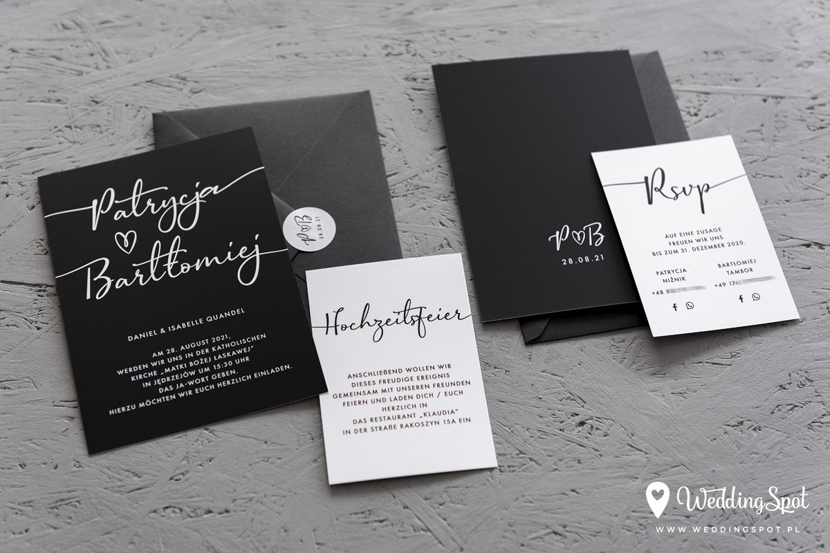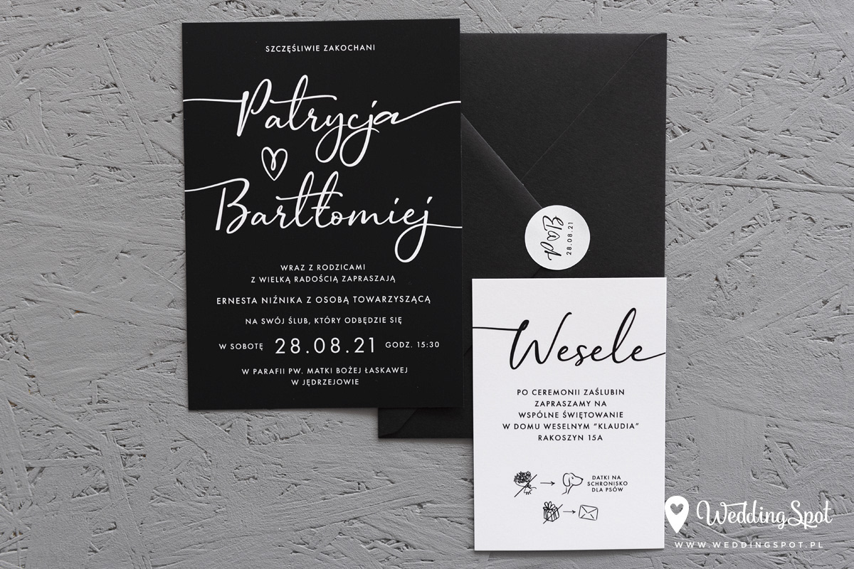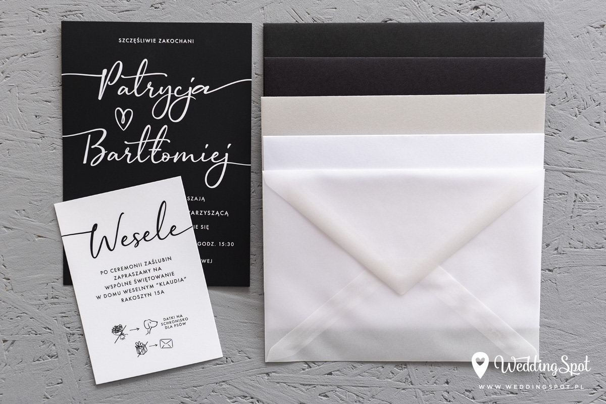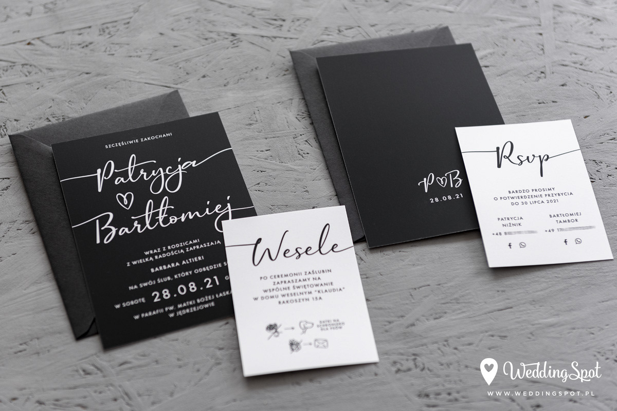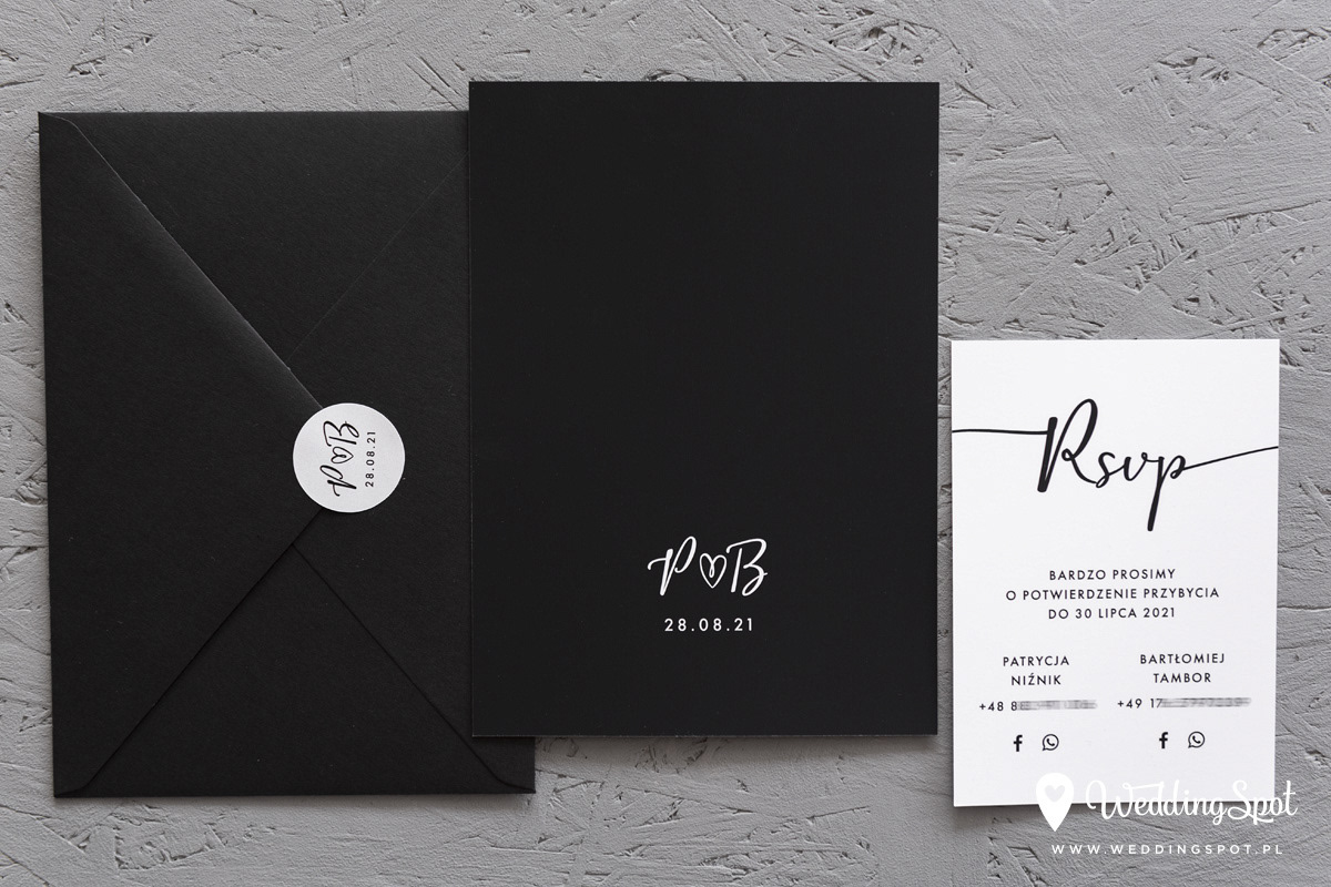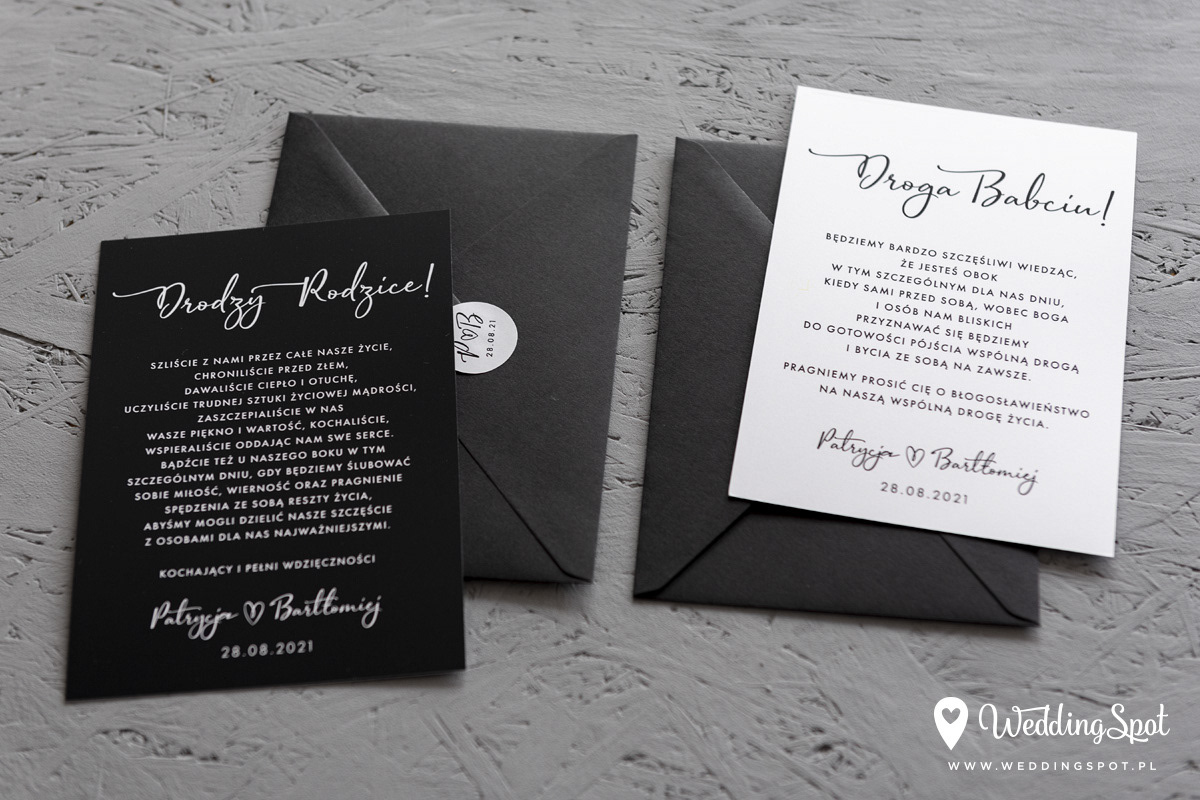 6,20 zł (od 176 szt.) 6,80 zł (101-175 szt.) 7,10 zł (76-100 szt.) 7,40 zł (50-75 szt.) W cenie: zaproszenie, karta wesele/RSVP, koperta w wybranym kolorze, personalizacja nazwisk na zaproszeniach Opłata za wykonanie uszlachetnienia (niezależnie od ilości sztuk): 100 zł Naklejka na zamknięcie koperty: od 0,60 zł Wymiary zaproszenia: 11 x 15,4 cm Wymiary karty wesele/RSVP: 7,7 x 11 cm Papier: DNS - klasa premium, o podwyższonym współczynniku białości, gramatura 300 g/m2 Uszlachetnienie: obustronna folia soft touch Istnieje możliwość modyfikacji wzoru oraz przesłania własnego tekstu do zaproszenia. Minimalne zamówienie: 50 sztuk Czas realizacji: do 10 dni roboczych