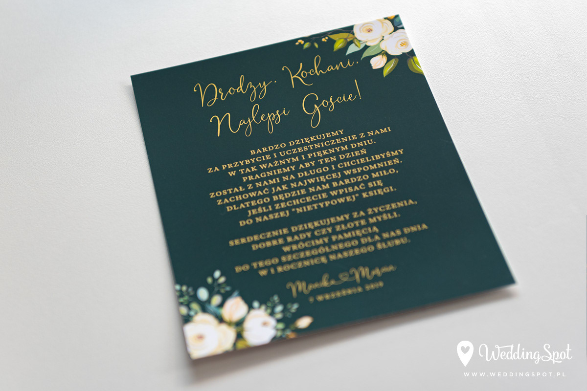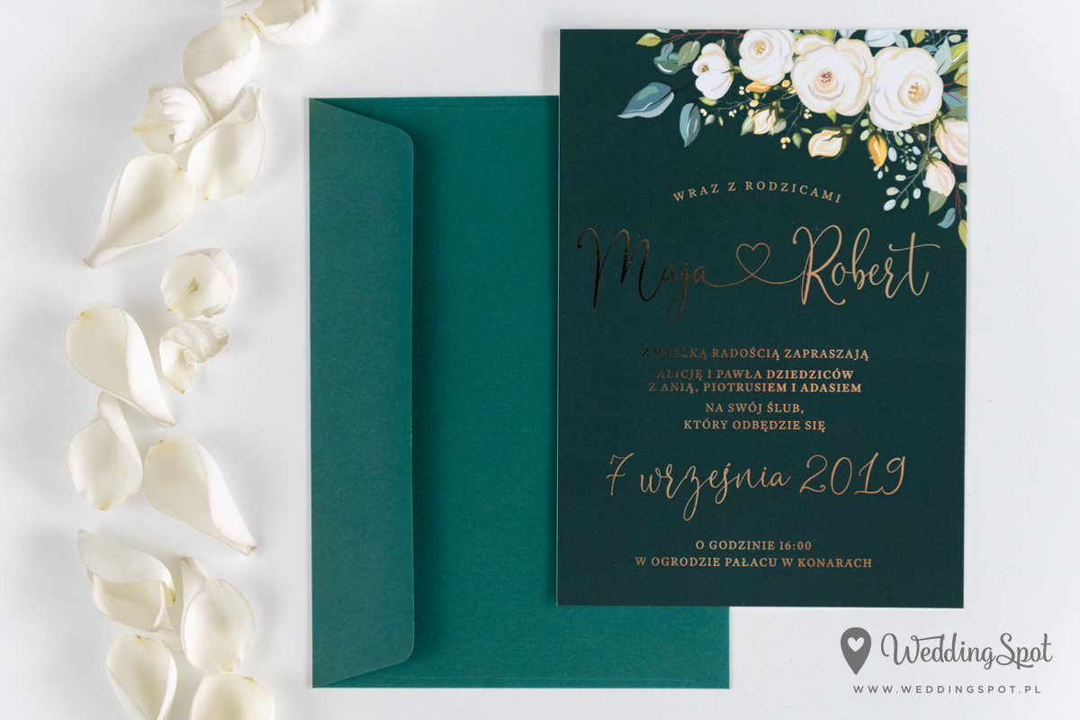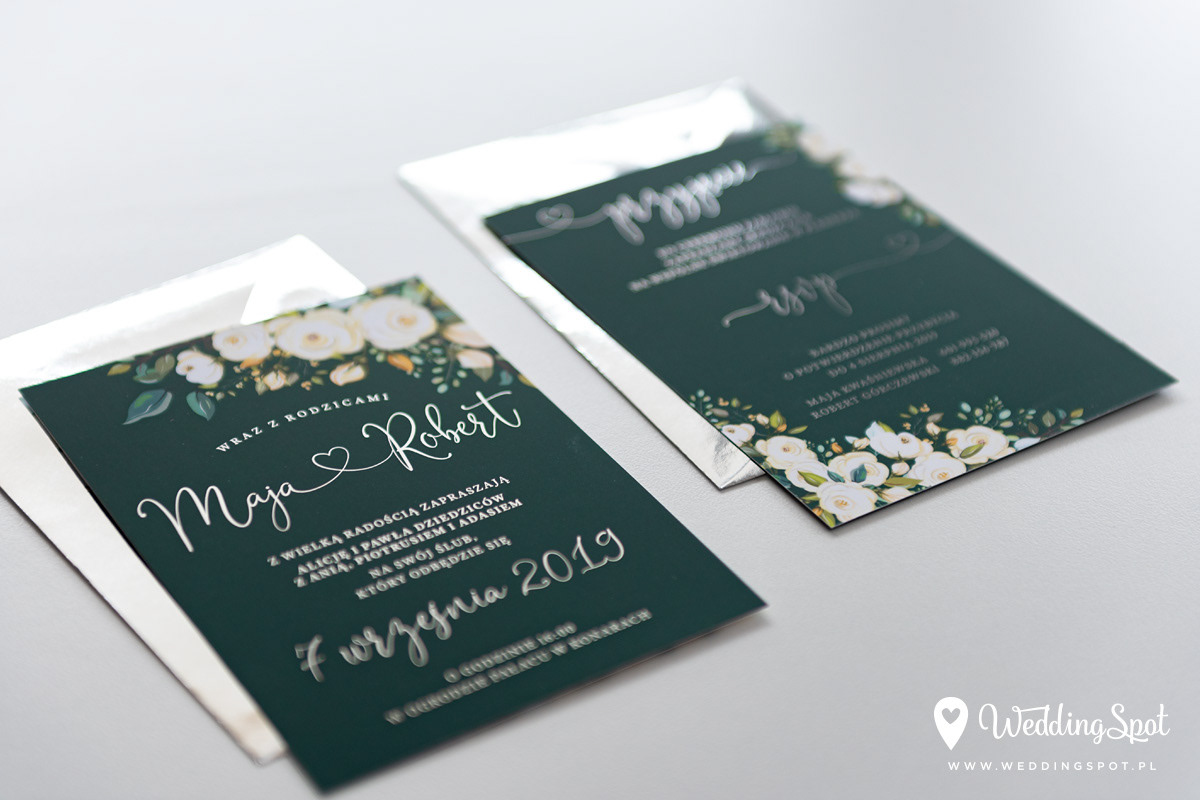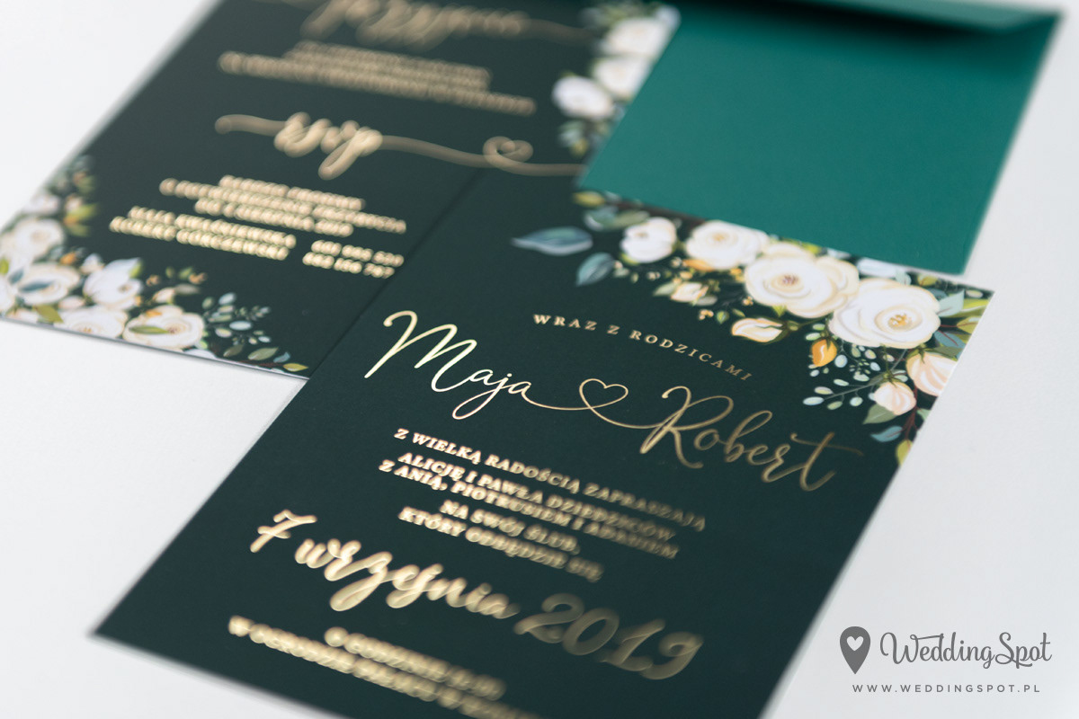 6,90 zł (od 176 szt.) 7,30 zł (101-175 szt.) 7,50 zł (76-100 szt.) 7,60 zł (50-75 szt.) W cenie: zaproszenie, koperta w wybranym kolorze, personalizacja nazwisk na zaproszeniach Opłata za wykonanie uszlachetnienia (niezależnie od ilości sztuk): 200 zł Złocona naklejka na kopertę: od 0,80 zł Wymiary zaproszenia: 11 x 15,4 cm Papier: biały matowy, gramatura 300 g/m2 Uszlachetnienie: obustronne złocenie, obustronna folia soft touch Istnieje możliwość modyfikacji wzoru oraz przesłania własnego tekstu do zaproszenia. Minimalne zamówienie: 50 sztuk Czas realizacji: do 10 dni roboczych