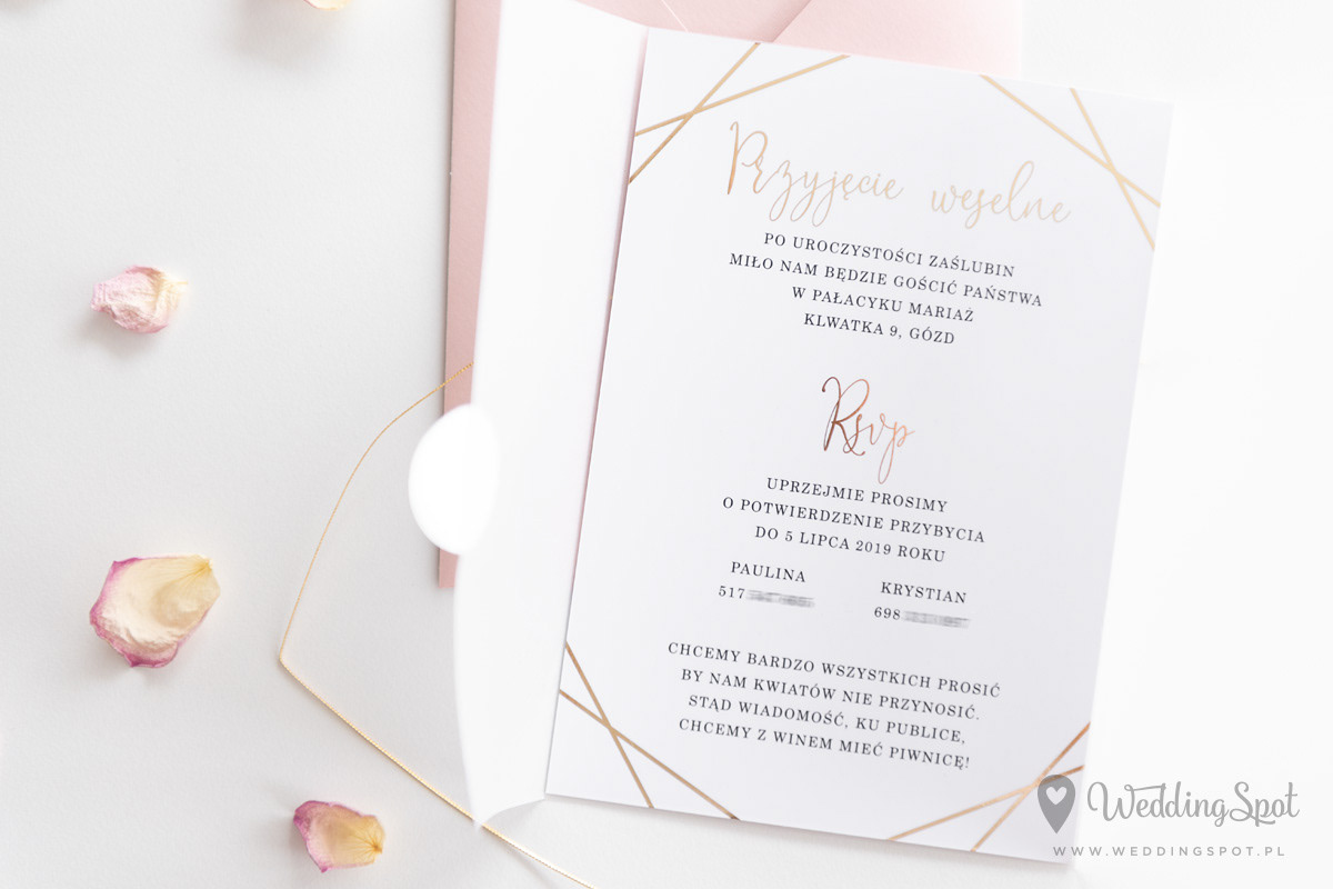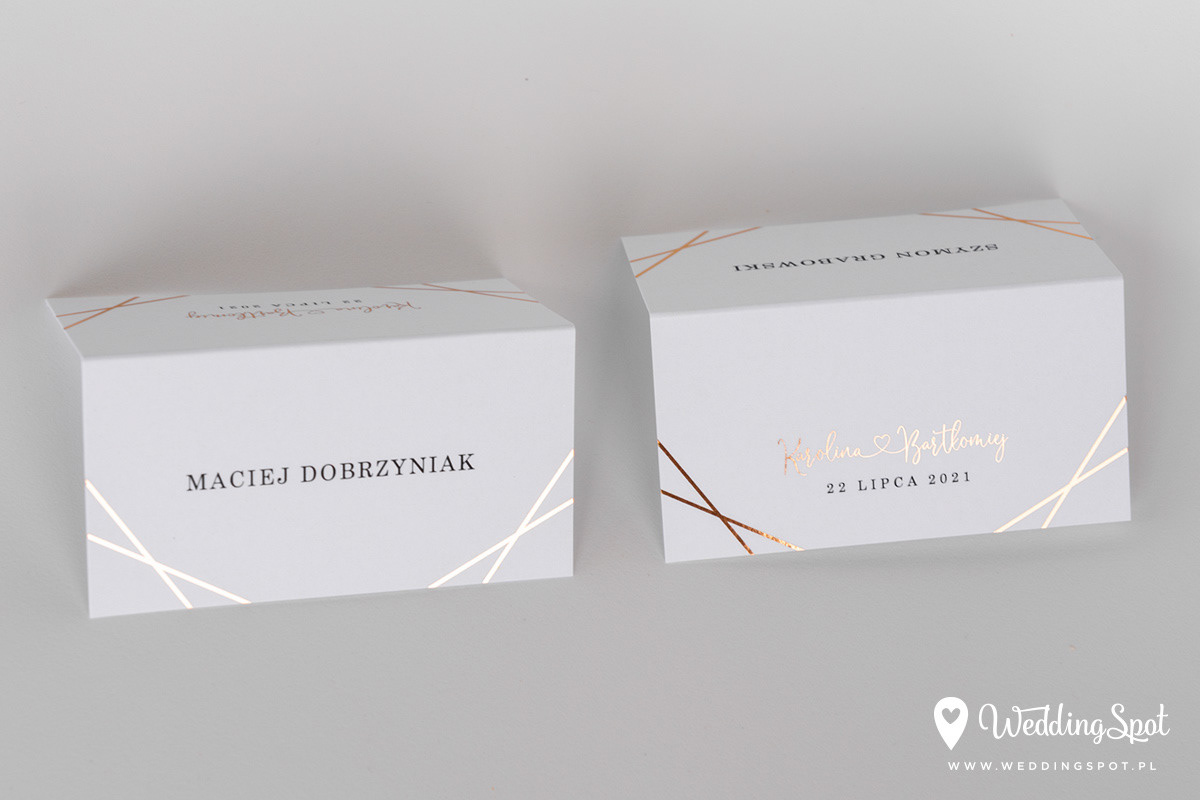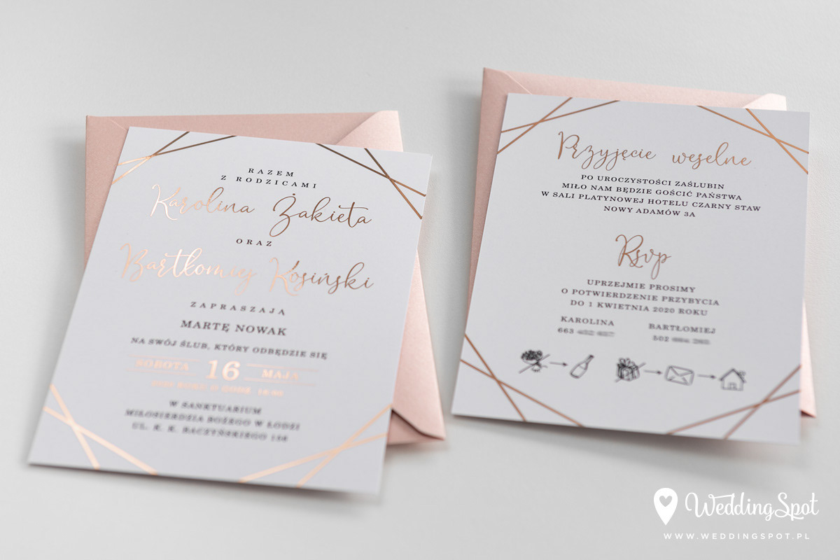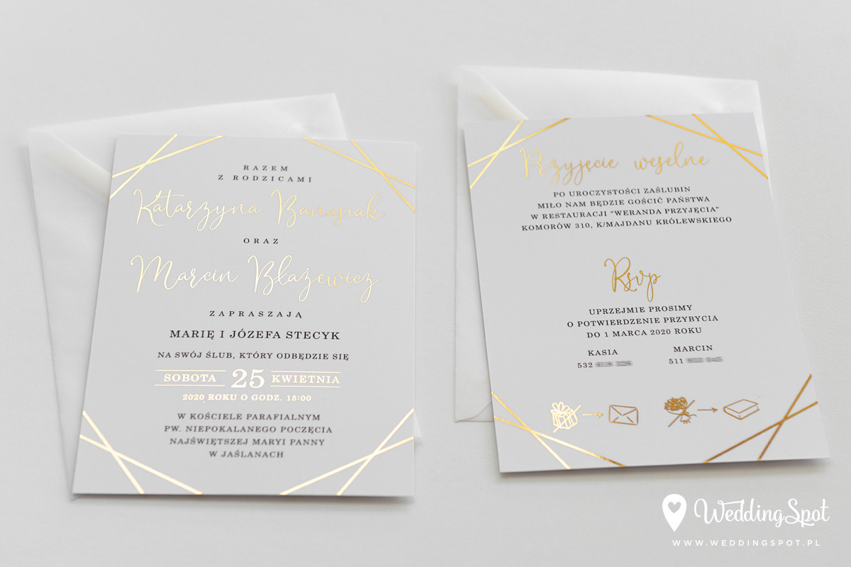9,50 zł (od 176 szt.) 10,10 zł (101-175 szt.) 10,40 zł (76-100 szt.) 10,70 zł (50-75 szt.) W cenie: zaproszenie, okładka z delikatnej kalki, złoty sznurek, naklejka, koperta w wybranym kolorze, personalizacja nazwisk na zaproszeniach Opłata za wykonanie uszlachetnienia (niezależnie od ilości sztuk): 200 zł Naklejka na zamknięcie koperty: od 0,60 zł Zaproszenie można zamówić również bez dodatków (z kopertą i personalizacją) w poniższych cenach: 6,90 zł (od 176 szt.) 7,30 zł (101-175 szt.) 7,50 zł (76-100 szt.) 7,60 zł (50-75 szt.) Opłata za wykonanie uszlachetnienia (niezależnie od ilości sztuk): 200 zł Wymiary zaproszenia: 11 x 15,4 cm Papier: biały matowy, gramatura 300 g/m2 Gramatura kalki: 90 g/m2 Uszlachetnienie: obustronne złocenie, obustronna folia soft touch Istnieje możliwość modyfikacji wzoru oraz przesłania własnego tekstu do zaproszenia. Minimalne zamówienie: 50 sztuk Czas realizacji: do 10 dni roboczych