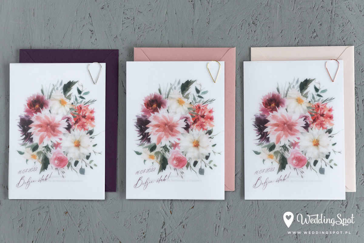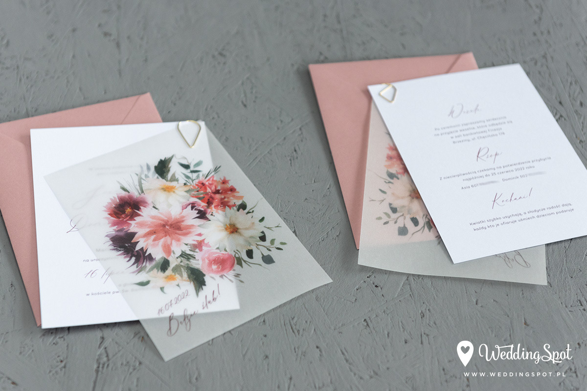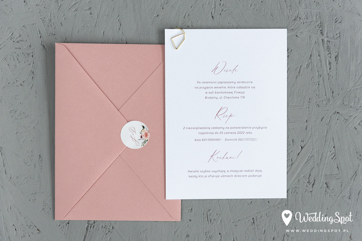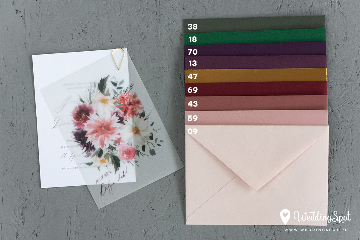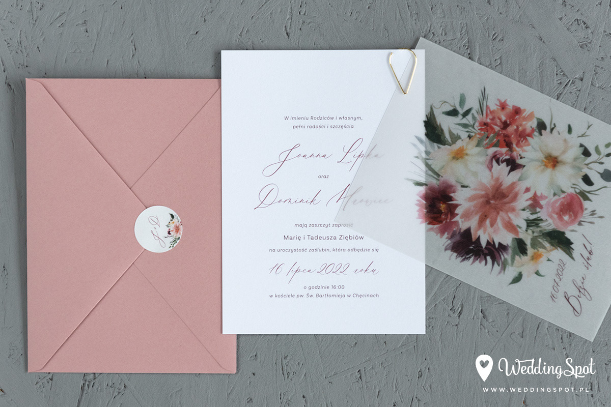 Cena: 6,10 zł od 176 szt. 6,20 zł 101-175 szt. 6,50 zł 76-100 szt. 6,60 zł 50-75 szt. W cenie: front z kalki, karta zaproszenia, spinacz w kolorze złotym, srebrnym lub rose gold, koperta w wybranym kolorze, personalizacja nazwisk na zaproszeniach Naklejka na kopertę: od 0,60 PLN Wymiary zaproszenia: 11 x 15,4 cm Papier: DNS - klasa premium, o podwyższonym współczynniku białości, gramatura 300 g/m2 Gramatura kalki: 160 g/m2 Istnieje możliwość modyfikacji wzoru oraz przesłania własnego tekstu do zaproszenia. Minimalne zamówienie: 50 szt.
