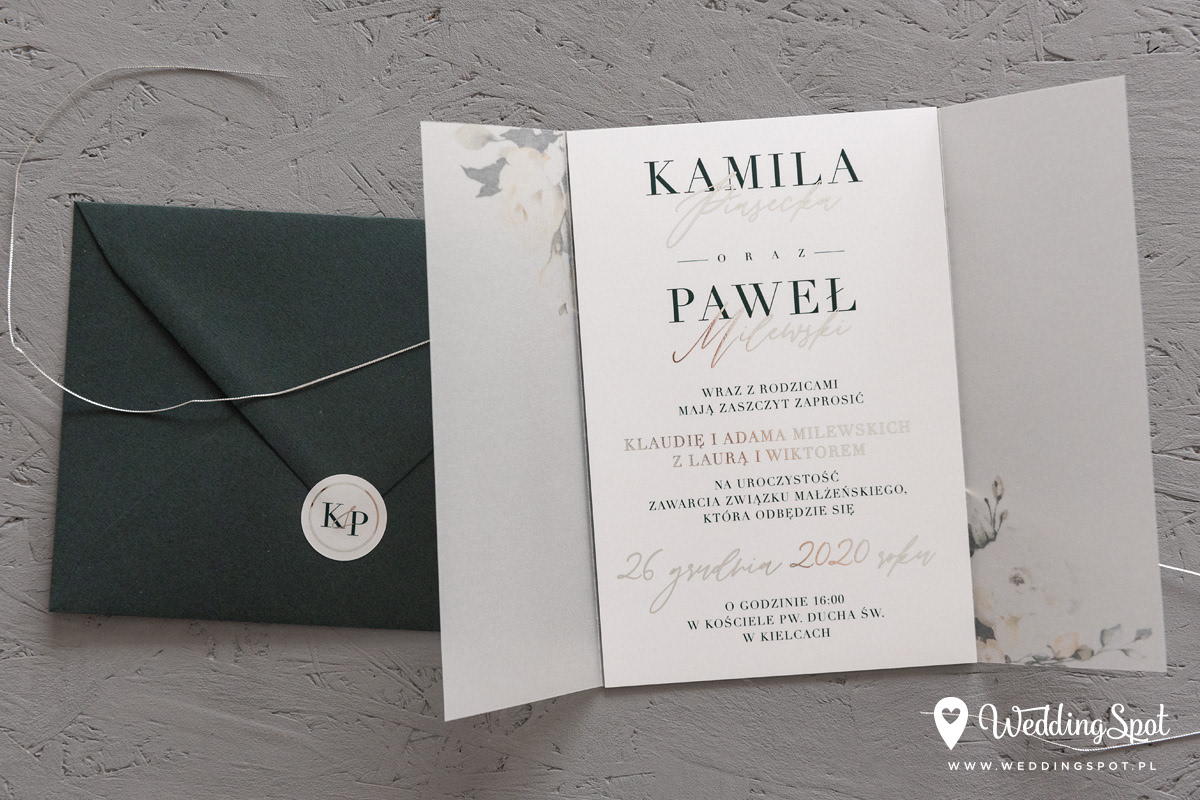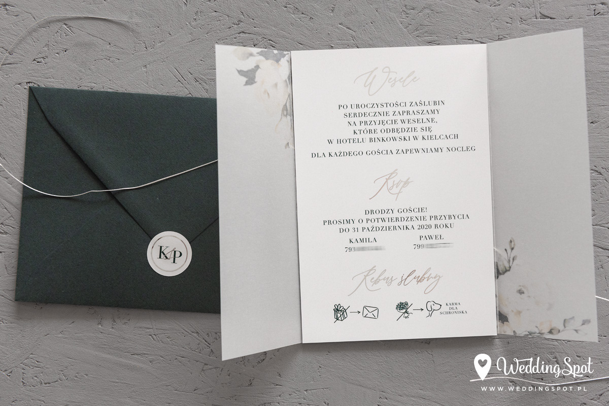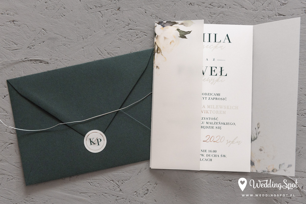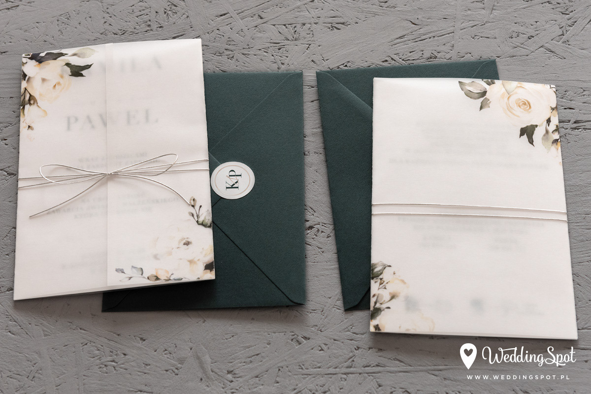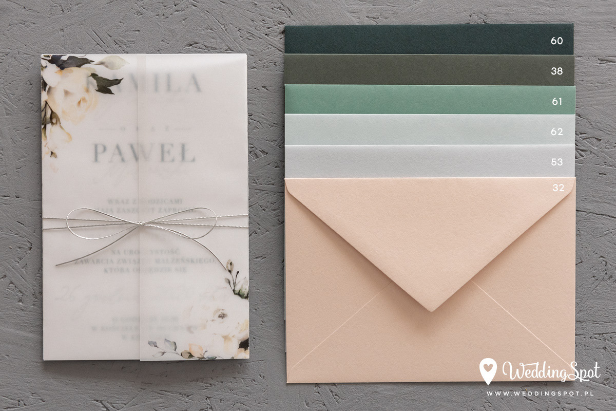 10,80 zł (od 176 szt.) 11,30 zł (101-175 szt.) 11,60 zł (76-100 szt.) 11,70 zł (50-75 szt.) W cenie: zaproszenie, okładka z kalki z kwiatowym motywem, srebrny sznurek do samodzielnego zawiązania, koperta w wybranym kolorze, personalizacja nazwisk na zaproszeniach Opłata za wykonanie uszlachetnienia (niezależnie od ilości sztuk): 200 zł Srebrzona naklejka na kopertę: od 0,80 zł Wymiary zaproszenia: 11,6 x 16,8 cm Papier: biały matowy, gramatura 300 g/m2 Gramatura kalki: 160 g/m2 Uszlachetnienie: obustronne srebrzenie, obustronna folia soft touch Istnieje możliwość modyfikacji wzoru oraz przesłania własnego tekstu do zaproszenia. Minimalne zamówienie: 50 sztuk Czas realizacji: do 10 dni roboczych