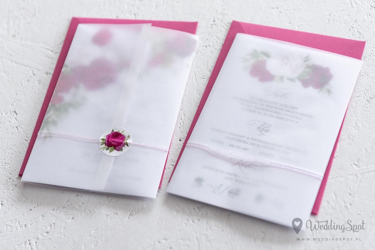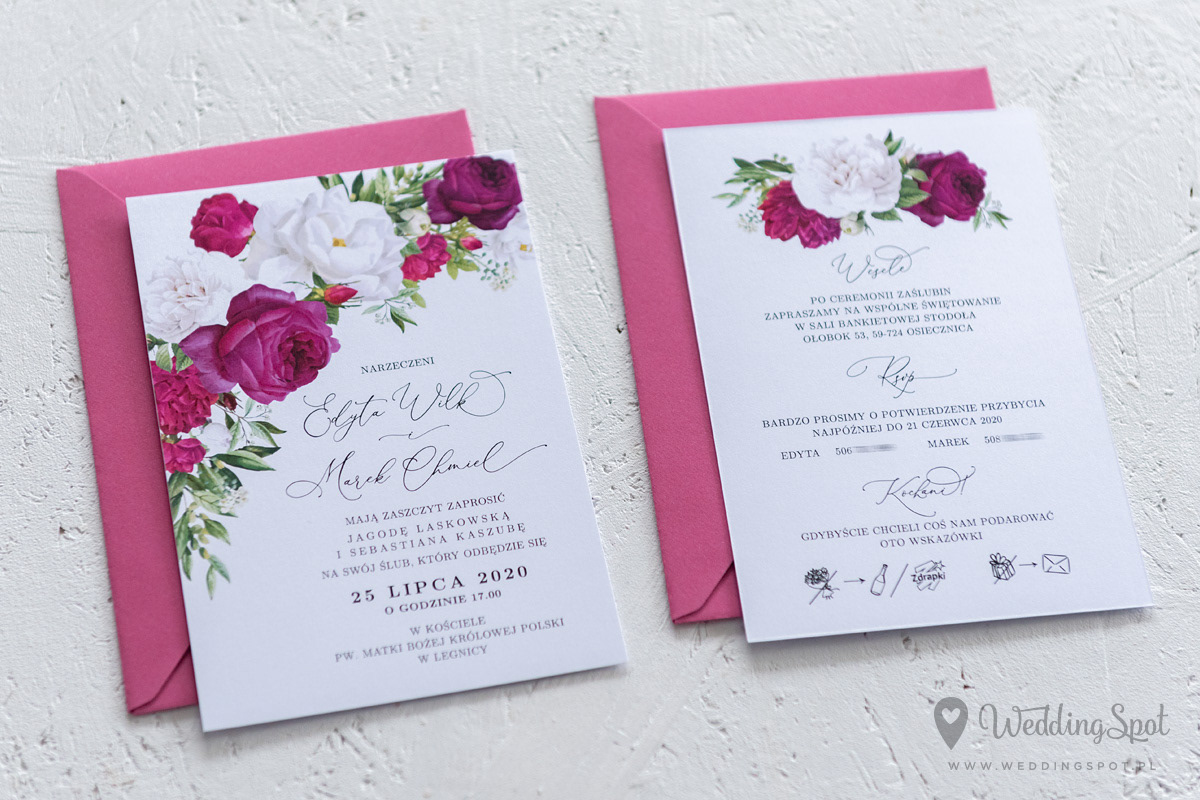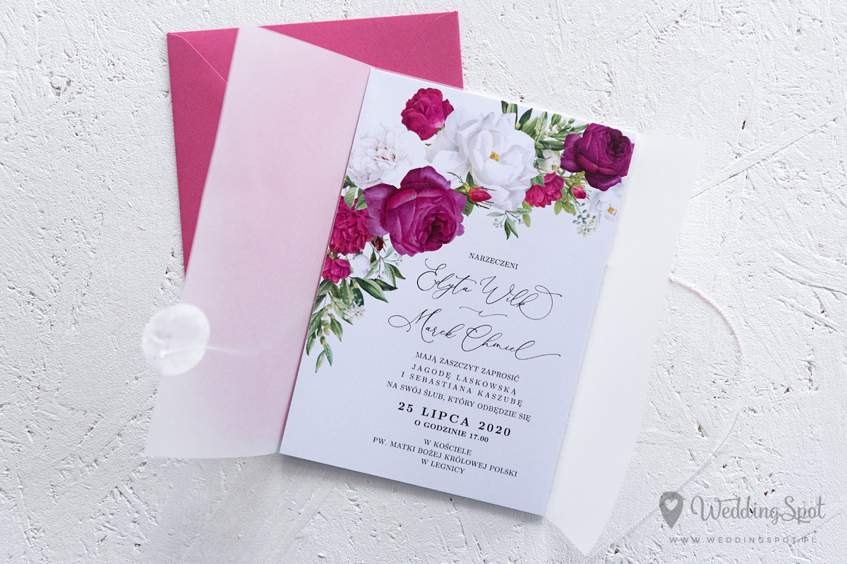 8,30 zł (od 176 szt.) 8,80 zł (101-175 szt.) 9,20 zł (76-100 szt.) 9,40 zł (50-75 szt.) W cenie: zaproszenie, okładka z delikatnej kalki, biały opalizujący sznurek, naklejka, koperta w wybranym kolorze, personalizacja nazwisk na zaproszeniach Naklejka na zamknięcie koperty: od 0,60 zł Wymiary zaproszenia: 11 x 15,4 cm Papier: DNS - klasa premium, o podwyższonym współczynniku białości, gramatura 300 g/m2 Gramatura kalki: 90 g/m2 Istnieje możliwość modyfikacji wzoru oraz przesłania własnego tekstu do zaproszenia. Minimalne zamówienie: 50 sztuk Czas realizacji: do 10 dni roboczych Zaproszenie można zamówić również bez dodatków (z kopertą i personalizacją) w poniższych cenach: 5,30 zł (od 176 szt.) 5,80 zł (101-175 szt.) 6,00 zł (76-100 szt.) 6,30 zł (50-75 szt.)