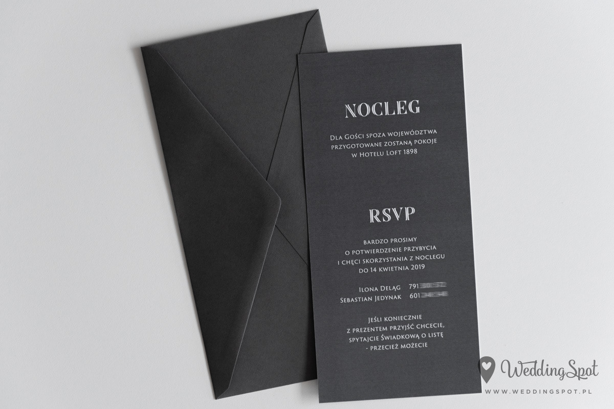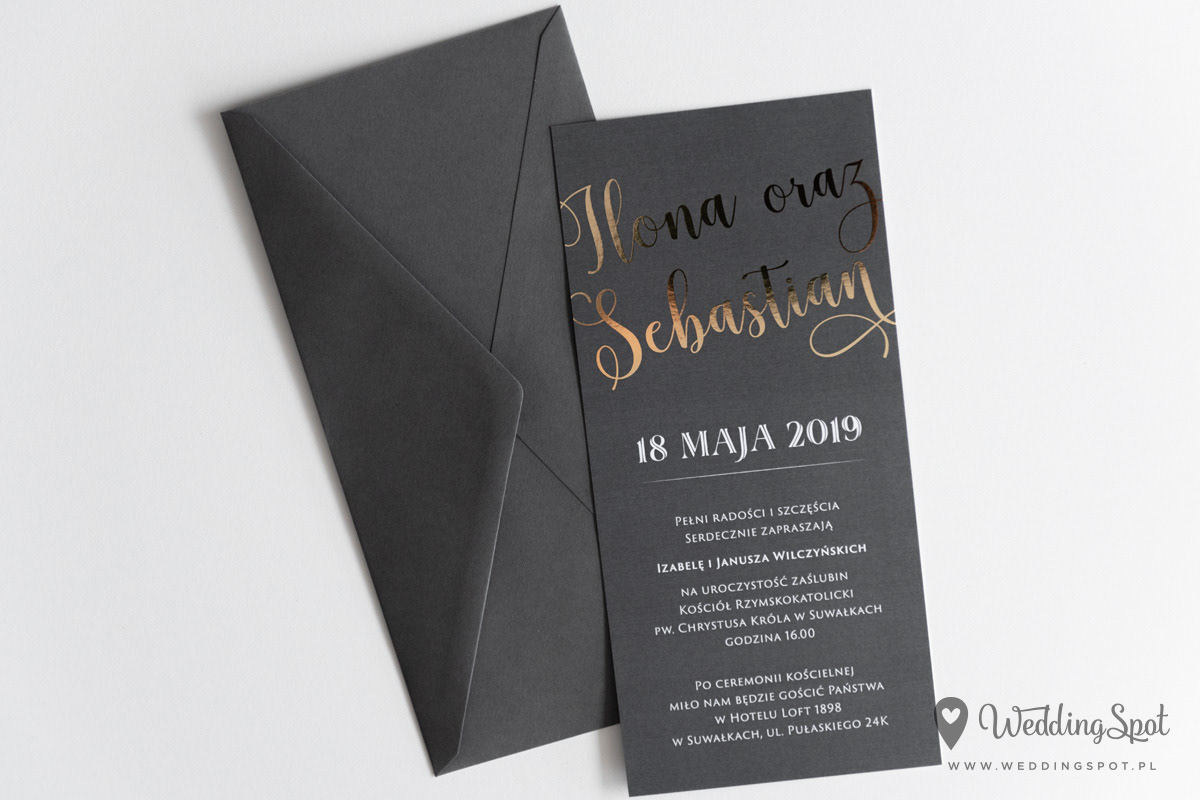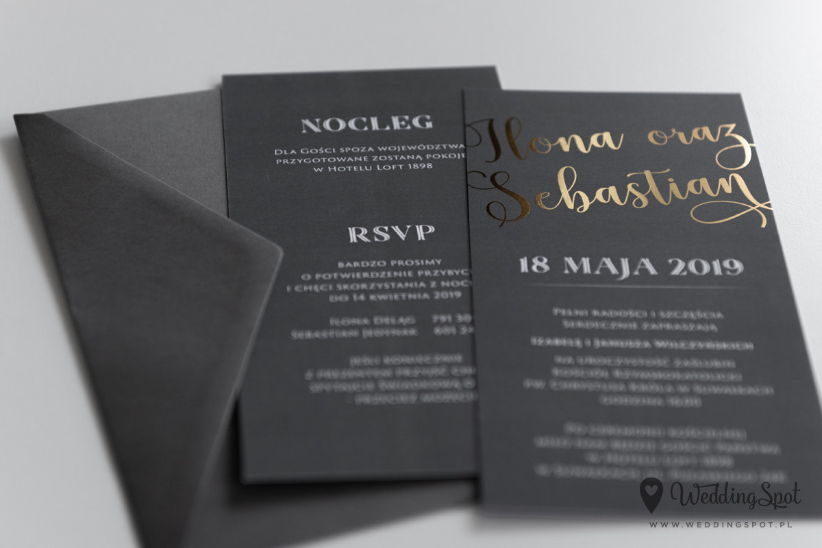 6,40 zł (od 176 szt.) 6,80 zł (101-175 szt.) 7,00 zł (76-100 szt.) 7,10 zł (50-75 szt.) W cenie: zaproszenie, koperta w wybranym kolorze, personalizacja nazwisk na zaproszeniach Opłata za wykonanie uszlachetnienia (niezależnie od ilości sztuk): 200 zł Złocona naklejka na kopertę: od 0,80 zł Wymiary zaproszenia: DL 9,9 x 21 cm Papier: biały matowy, gramatura 300 g/m2 Uszlachetnienie: jednostronne złocenie, obustronna folia soft touch Istnieje możliwość modyfikacji wzoru oraz przesłania własnego tekstu do zaproszenia. Minimalne zamówienie: 50 sztuk Czas realizacji: do 10 dni roboczych