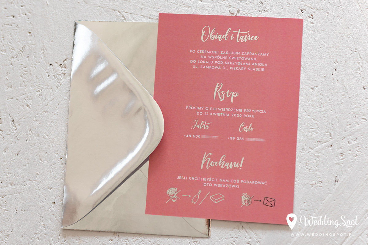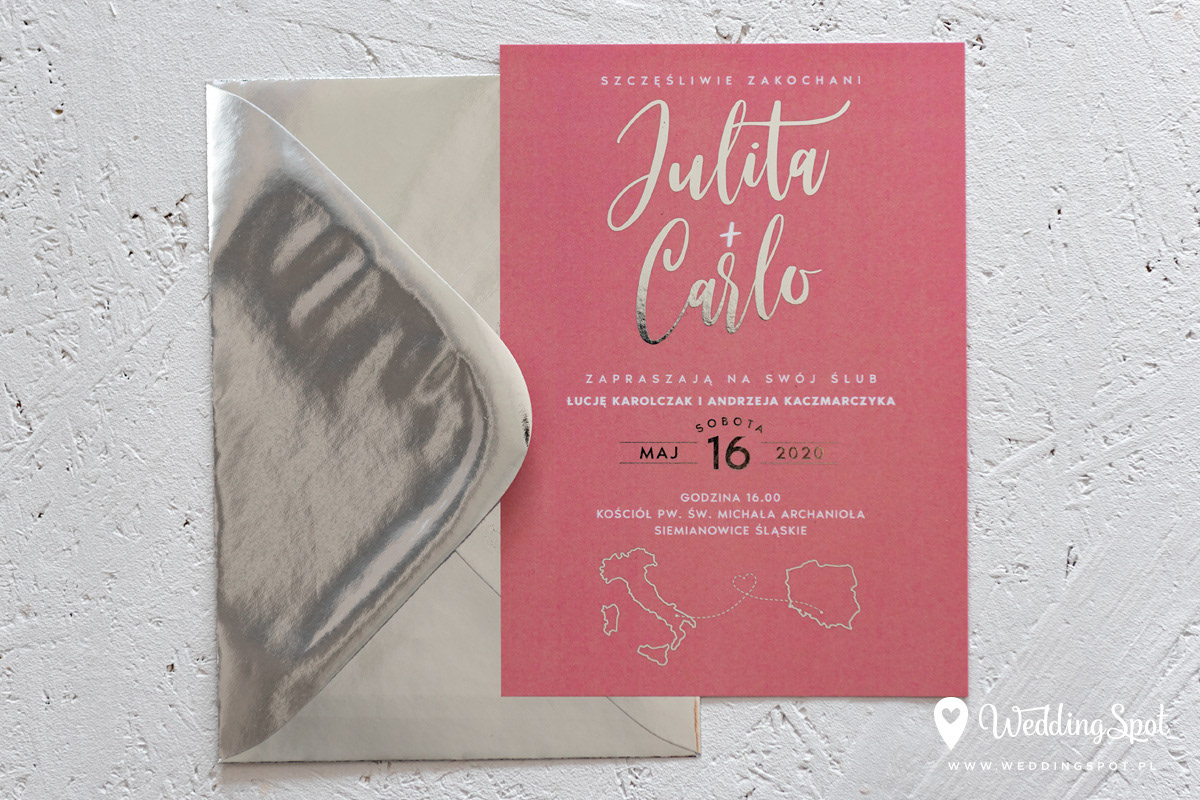 6,90 zł (od 176 szt.) 7,30 zł (101-175 szt.) 7,50 zł (76-100 szt.) 7,60 zł (50-75 szt.) W cenie: zaproszenie, koperta w wybranym kolorze, personalizacja nazwisk na zaproszeniach Opłata za wykonanie uszlachetnienia (niezależnie od ilości sztuk): 200 zł Srebrzona naklejka na kopertę: od 0,80 zł Wymiary zaproszenia: 11 x 15,4 cm Papier: biały matowy, gramatura 300 g/m2 Uszlachetnienie: obustronne srebrzenie, obustronna folia soft touch Istnieje możliwość modyfikacji wzoru oraz przesłania własnego tekstu do zaproszenia. Minimalne zamówienie: 50 sztuk Czas realizacji: do 10 dni roboczych