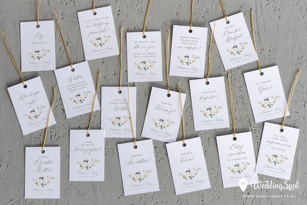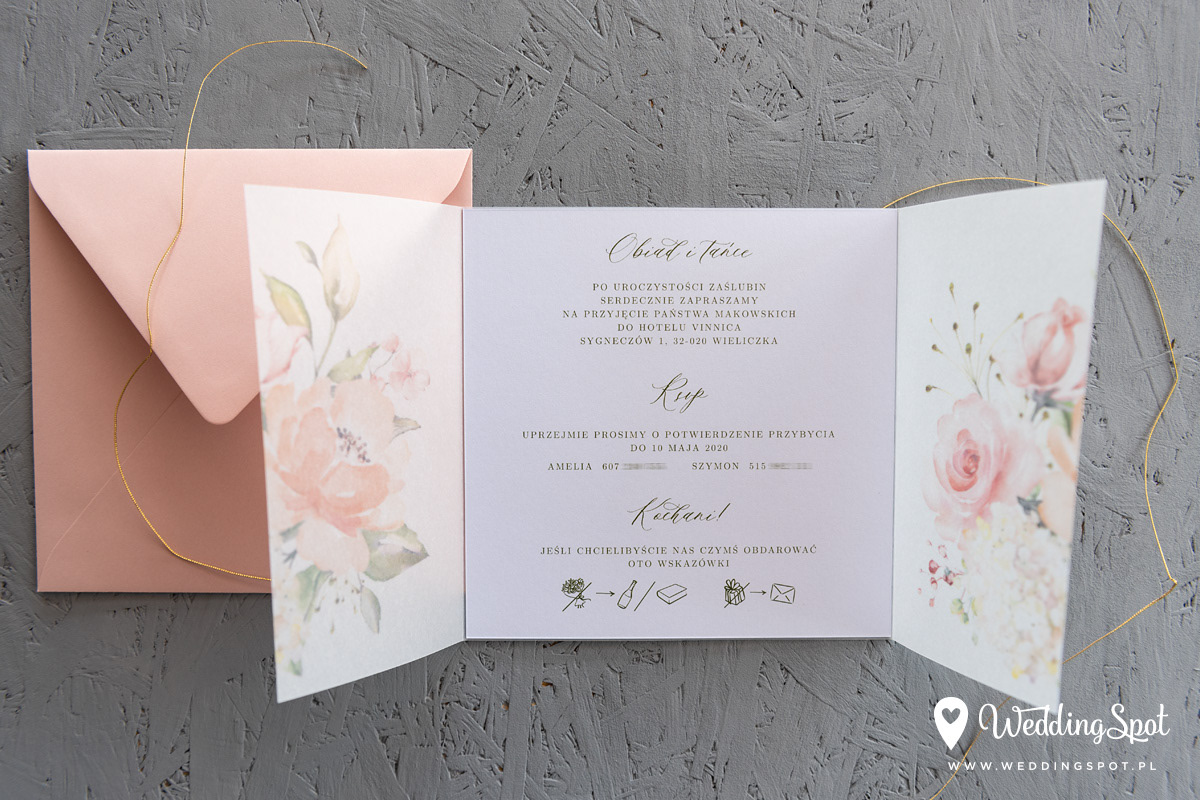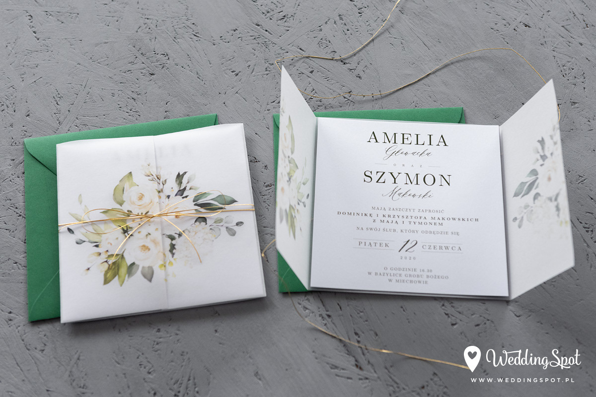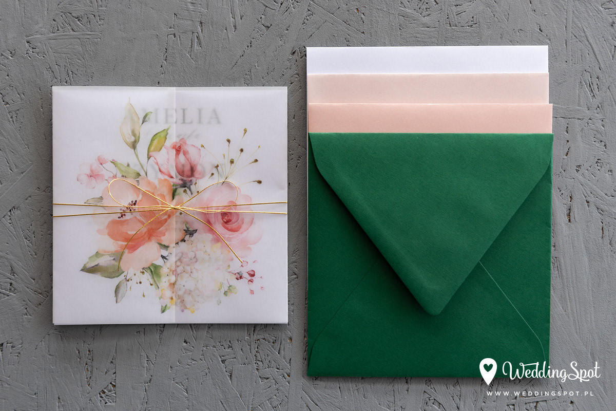 8,20 zł (od 176 szt.) 8,60 zł (101-175 szt.) 8,80 zł (76-100 szt.) 9,00 zł (50-75 szt.) W cenie: zaproszenie, okładka z kalki z kwiatowym motywem, złoty sznurek do samodzielnego zawiązania, koperta w wybranym kolorze, personalizacja nazwisk na zaproszeniach Naklejka na zamknięcie koperty: od 0,60 zł Wymiary zaproszenia: 14,6 x 14,6 cm Papier: DNS - klasa premium, o podwyższonym współczynniku białości, gramatura 300 g/m2 Gramatura kalki: 160 g/m2 Istnieje możliwość modyfikacji wzoru oraz przesłania własnego tekstu do zaproszenia. Minimalne zamówienie: 50 sztuk Czas realizacji: do 10 dni roboczych