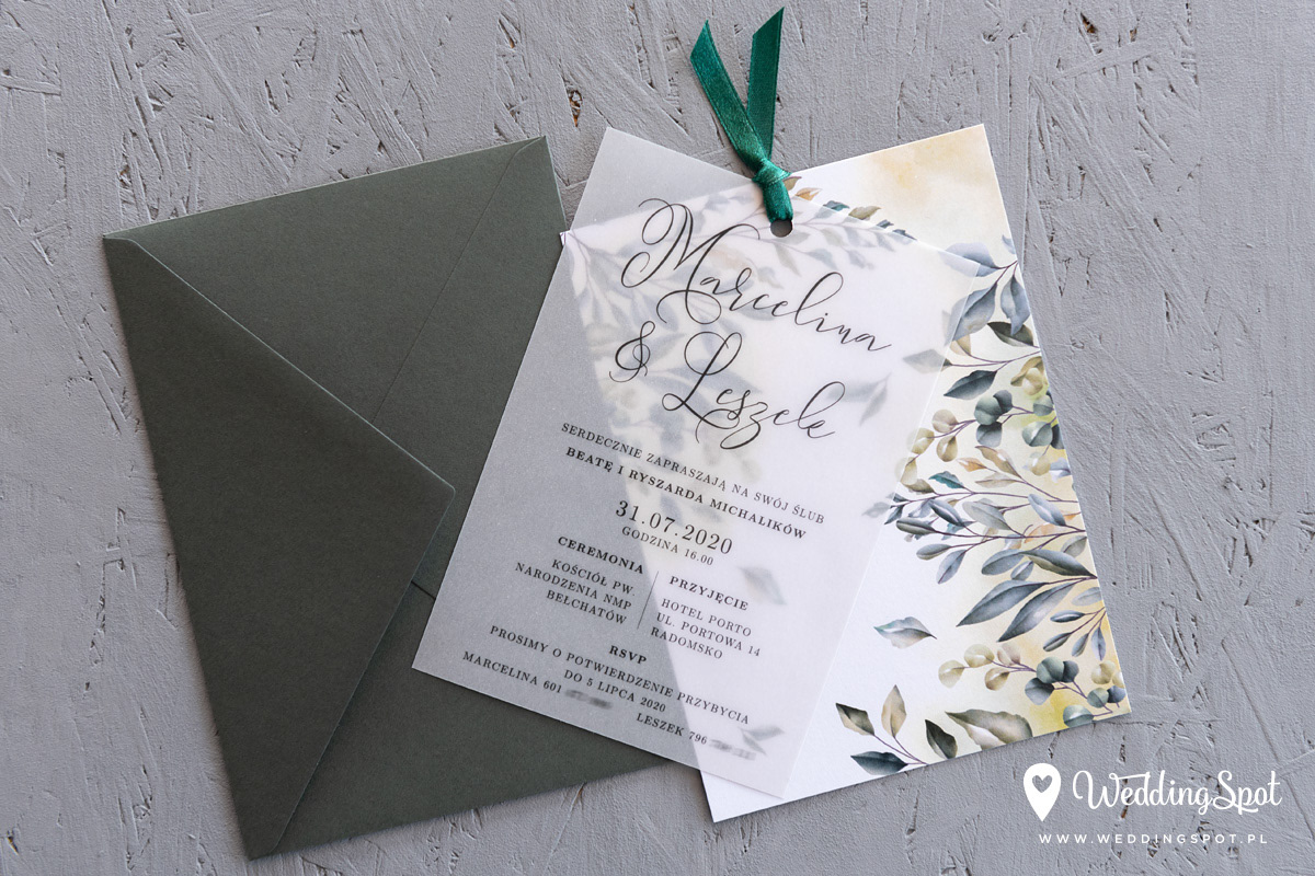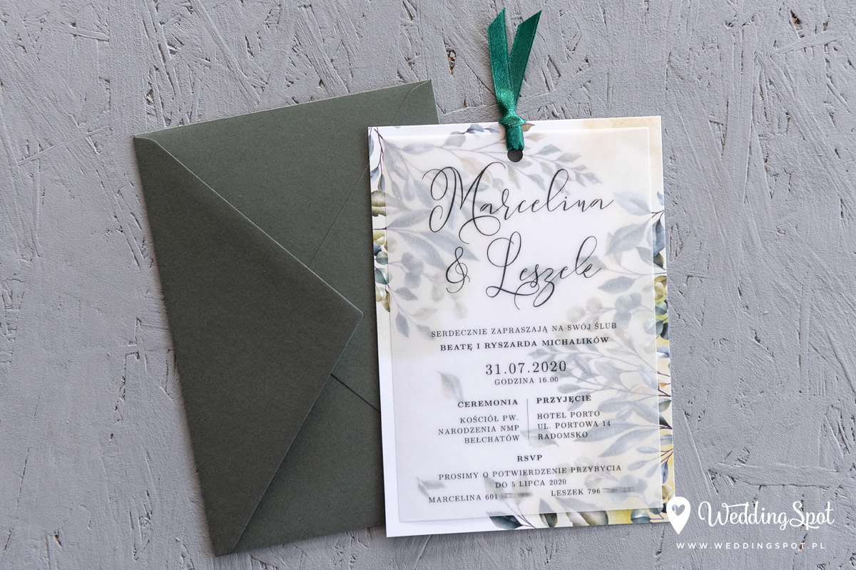 6,90 zł (od 176 szt.) 7,40 zł (101-175 szt.) 7,60 zł (76-100 szt.) 7,80 zł (50-75 szt.) W cenie: zaproszenie z kalki, karta z motywem liści, satynowa wstążka, koperta w wybranym kolorze, personalizacja nazwisk na zaproszeniach Naklejka na zamknięcie koperty: od 0,60 zł Wymiary zaproszenia: 11 x 15 cm Papier: DNS - klasa premium, o podwyższonym współczynniku białości, gramatura 300 g/m2 Gramatura kalki: 160 g/m2 Istnieje możliwość modyfikacji wzoru oraz przesłania własnego tekstu do zaproszenia. Minimalne zamówienie: 50 sztuk Czas realizacji: do 10 dni roboczych