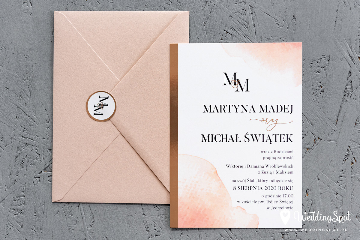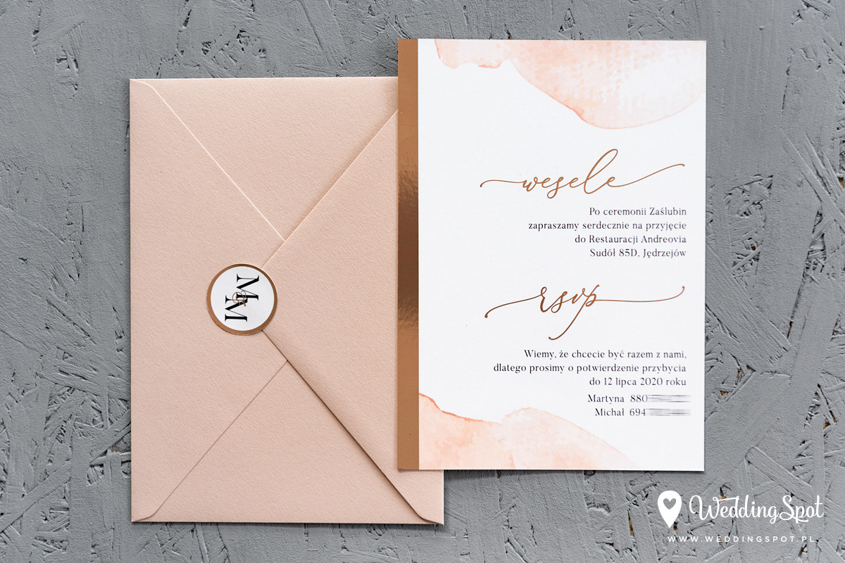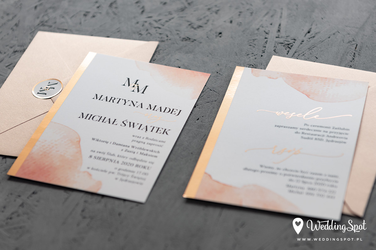 7,20 zł (od 176 szt.) 7,60 zł (101-175 szt.) 7,80 zł (76-100 szt.) 7,90 zł (50-75 szt.) W cenie: zaproszenie, koperta w wybranym kolorze, personalizacja nazwisk na zaproszeniach Opłata za wykonanie uszlachetnienia (niezależnie od ilości sztuk): 200 zł Naklejka rose gold na kopertę: od 0,80 zł Wymiary zaproszenia: 11 x 15,4 cm Papier: biały matowy, gramatura 300 g/m2 Uszlachetnienie: obustronna folia rose gold, obustronna folia soft touch Istnieje możliwość modyfikacji wzoru oraz przesłania własnego tekstu do zaproszenia. Minimalne zamówienie: 50 sztuk Czas realizacji: do 10 dni roboczych