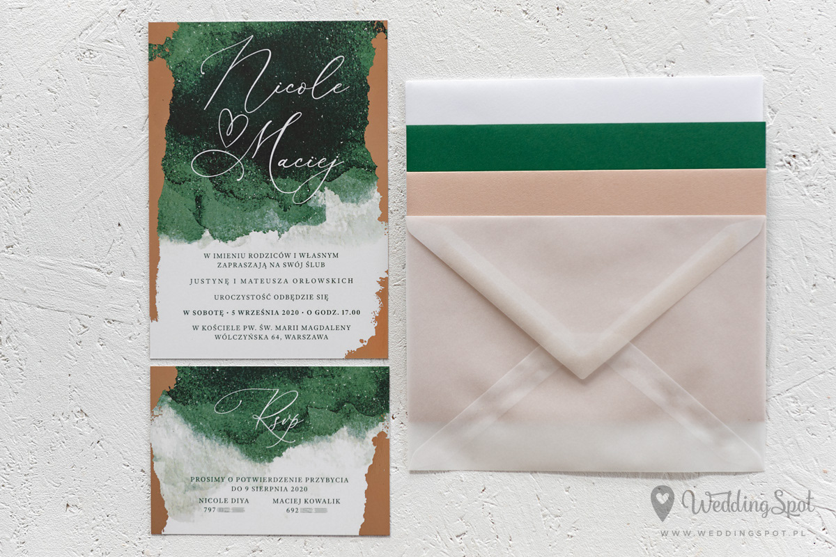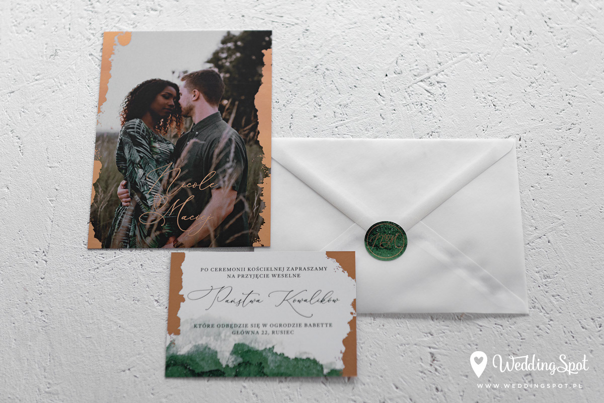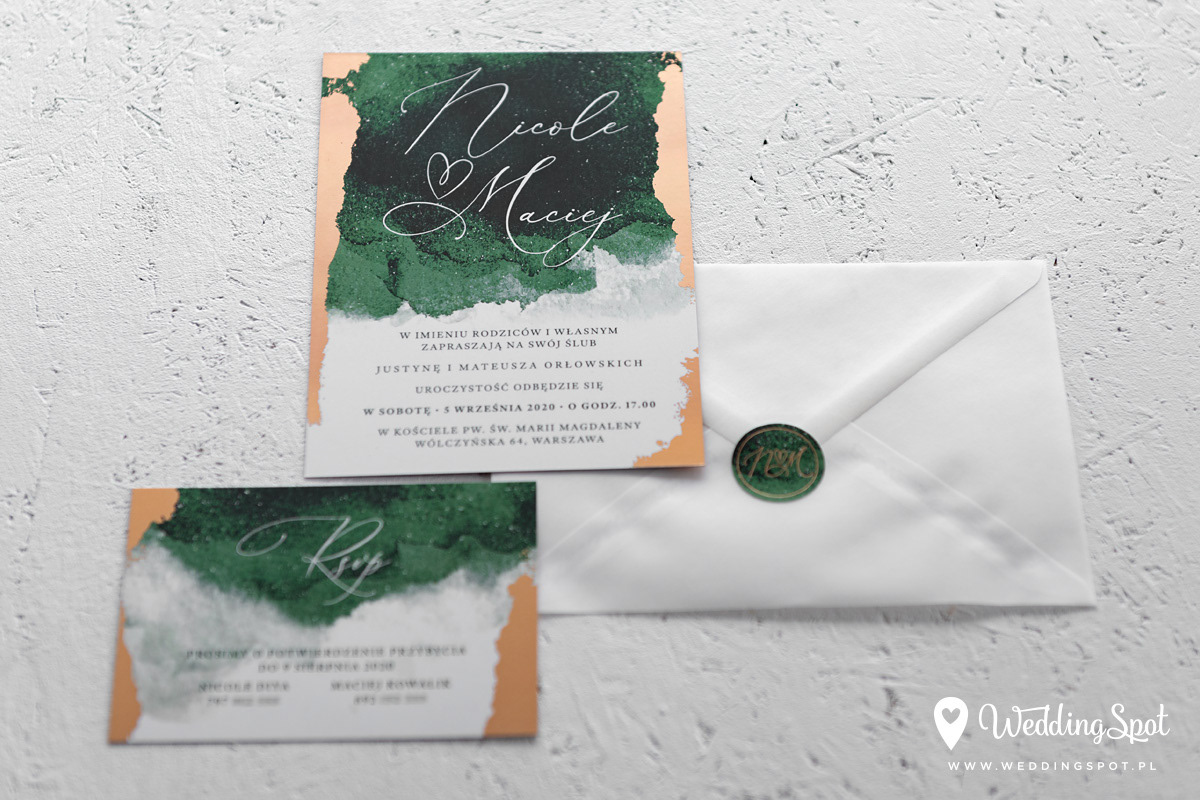 9,30 zł (od 176 szt.) 9,80 zł (101-175 szt.) 10,10 zł (76-100 szt.) 10,30 zł (50-75 szt.) W cenie: zaproszenie, karta RSVP, koperta w wybranym kolorze, personalizacja nazwisk na zaproszeniach Opłata za wykonanie uszlachetnienia (niezależnie od ilości sztuk): 200 zł Naklejka rose gold na zamknięcie koperty: od 0,80 zł Wymiary zaproszenia: 11 x 15,4 cm Wymiary karty RSVP: 11 x 7,7 cm Papier: biały matowy, gramatura 300 g/m2 Uszlachetnienie: obustronna folia rose gold, obustronna folia soft touch Istnieje możliwość modyfikacji wzoru oraz przesłania własnego tekstu do zaproszenia. Minimalne zamówienie: 50 sztuk Czas realizacji: do 10 dni roboczych