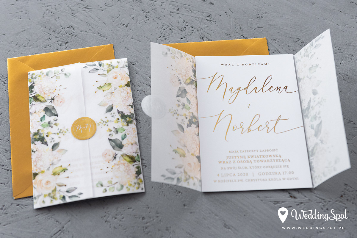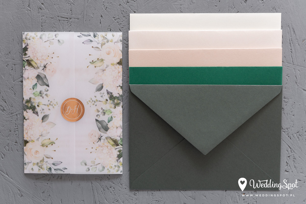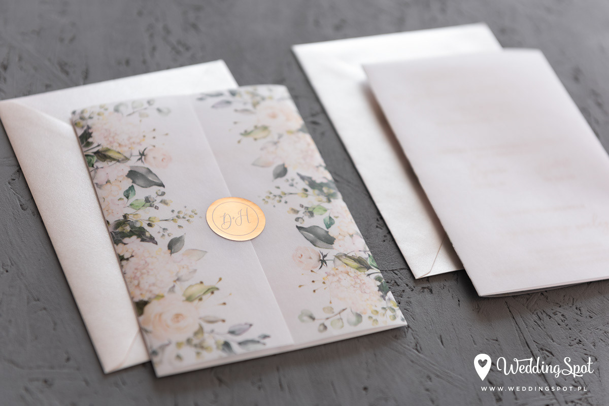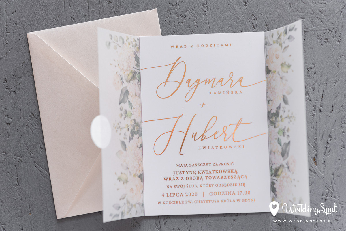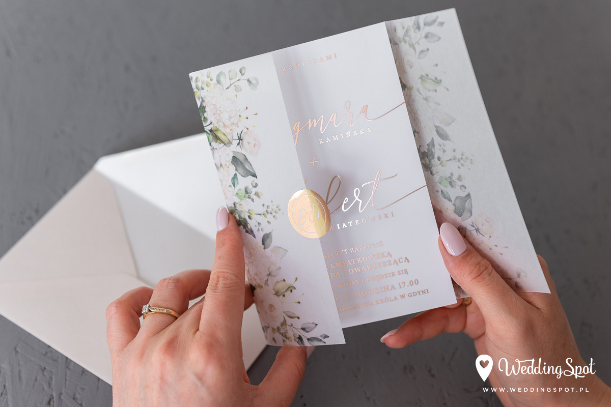 9,70 zł (od 176 szt.) 10,30 zł (101-175 szt.) 10,60 zł (76-100 szt.) 10,70 zł (50-75 szt.) W cenie: zaproszenie, okładka z kalki z kwiatowym motywem, naklejka rose gold na kalkę, koperta w wybranym kolorze, personalizacja nazwisk na zaproszeniach Opłata za wykonanie uszlachetnienia (niezależnie od ilości sztuk): 200 zł Naklejka rose gold na zamknięcie koperty: od 0,80 zł Wymiary zaproszenia: 11 x 15,4 cm Papier: biały matowy, gramatura 300 g/m2 Gramatura kalki: 160 g/m2 Uszlachetnienie: obustronna folia rose gold, obustronna folia soft touch Istnieje możliwość modyfikacji wzoru oraz przesłania własnego tekstu do zaproszenia. Minimalne zamówienie: 50 sztuk Czas realizacji: do 10 dni roboczych