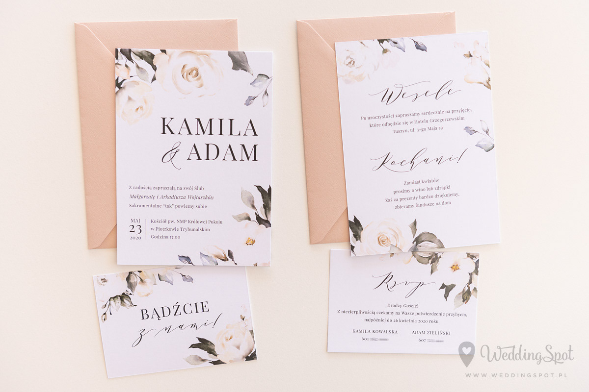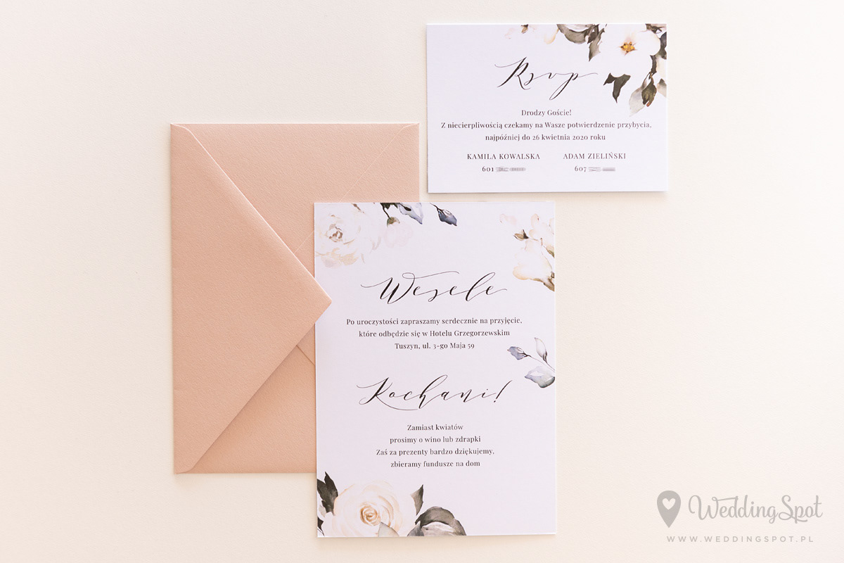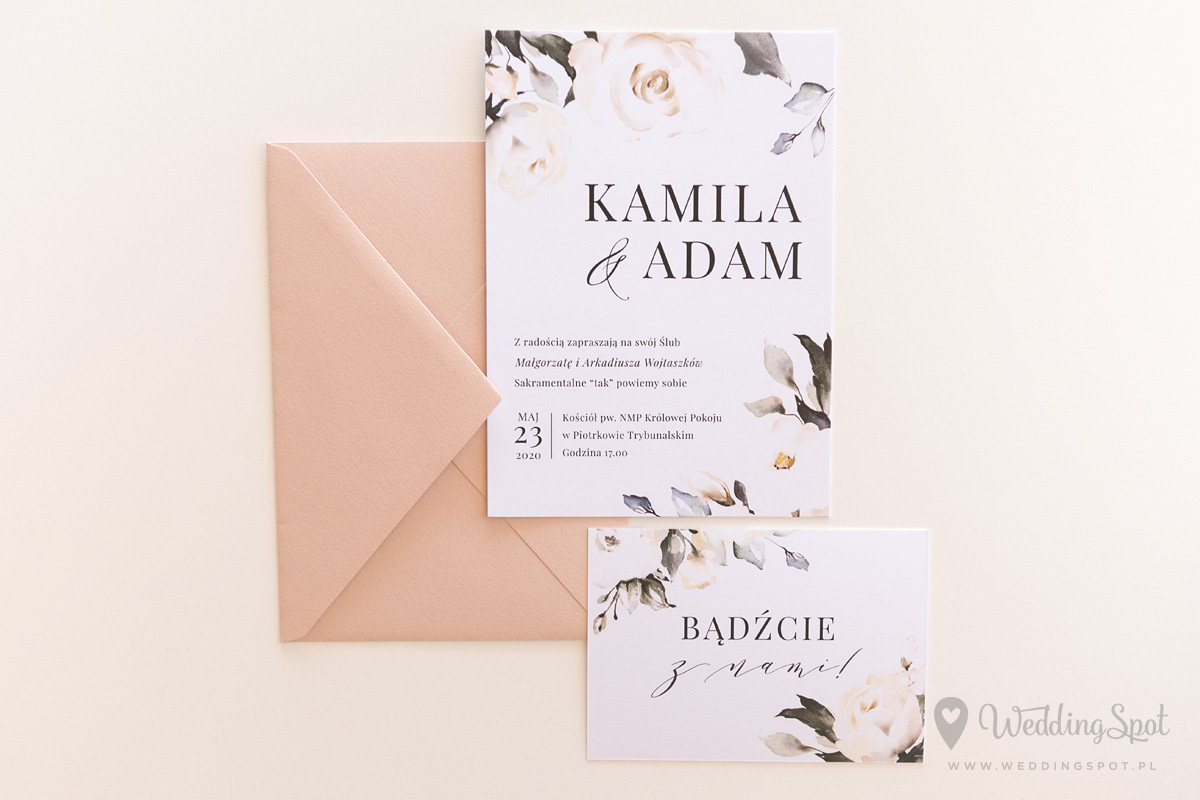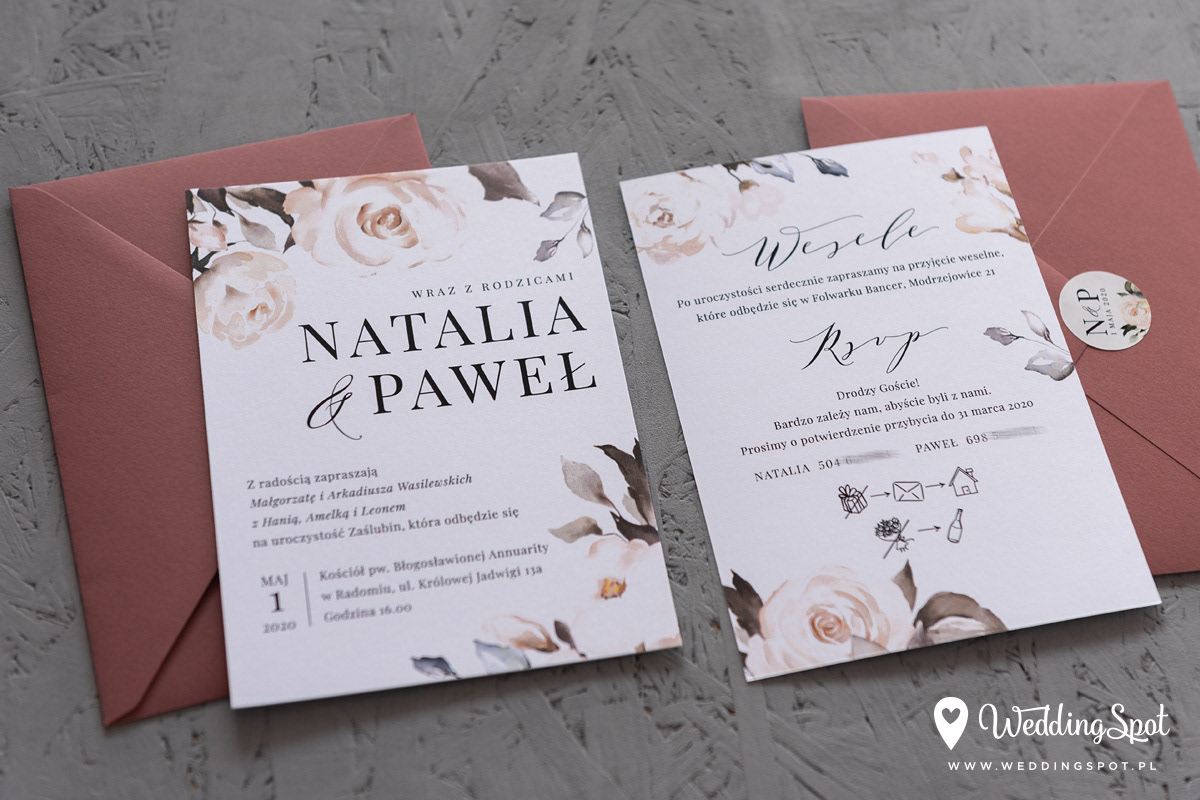 6,20 zł (od 176 szt.) 6,80 zł (101-175 szt.) 7,10 zł (76-100 szt.) 7,40 zł (50-75 szt.) W cenie: zaproszenie, karta RSVP, koperta w wybranym kolorze, personalizacja nazwisk na zaproszeniach Naklejka na kopertę: od 0,60 zł Wymiary zaproszenia: 11 x 15,4 cm Wymiary karty RSVP: 11 x 7,7 cm Papier: DNS - klasa premium, o podwyższonym współczynniku białości, gramatura 300 g/m2 Istnieje możliwość modyfikacji wzoru oraz przesłania własnego tekstu do zaproszenia. Minimalne zamówienie: 50 sztuk Czas realizacji: do 10 dni roboczych