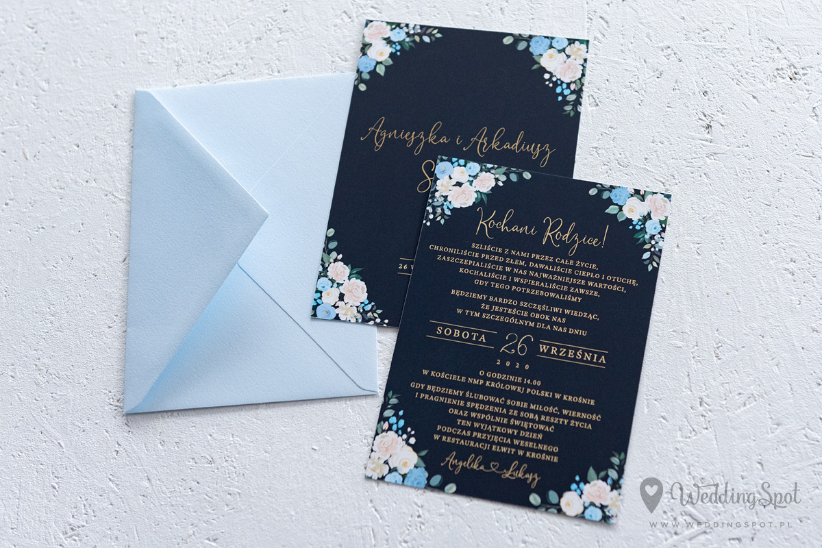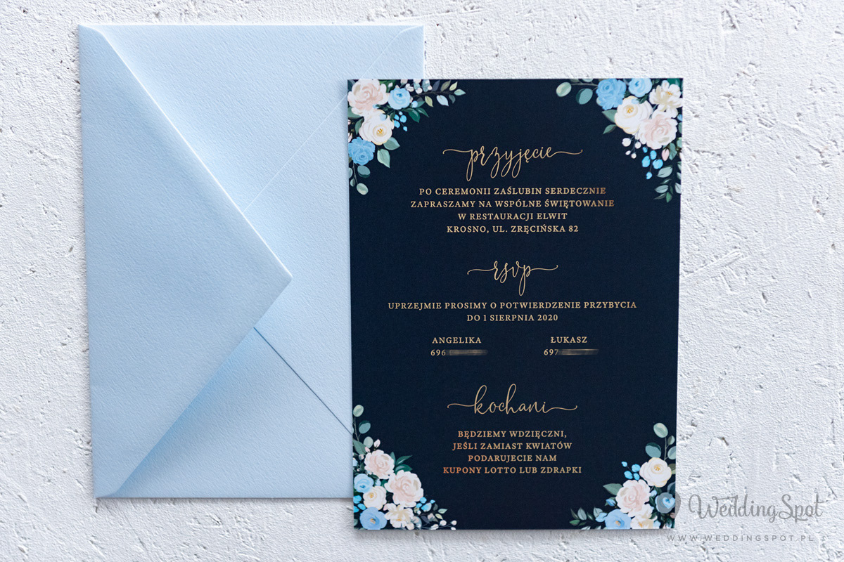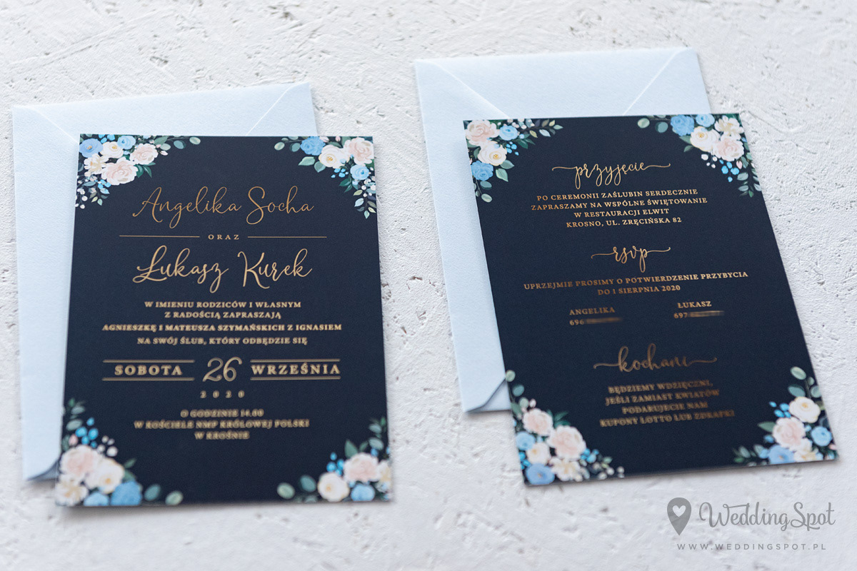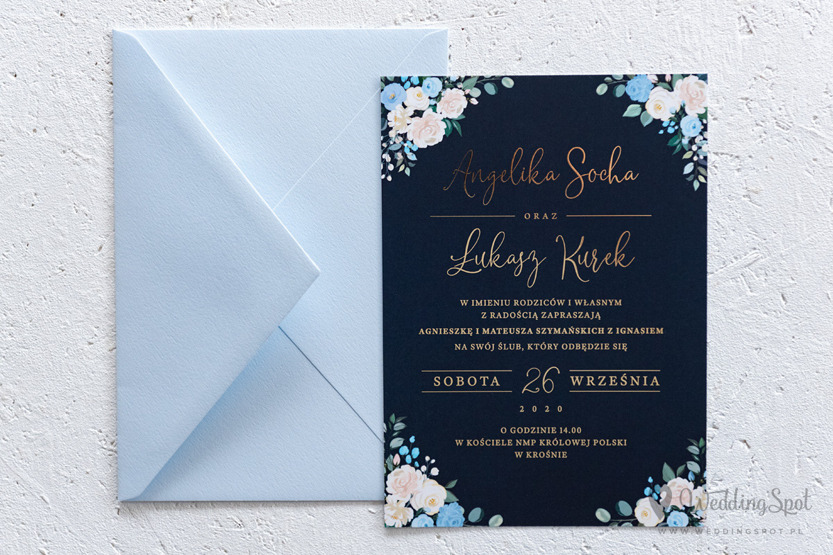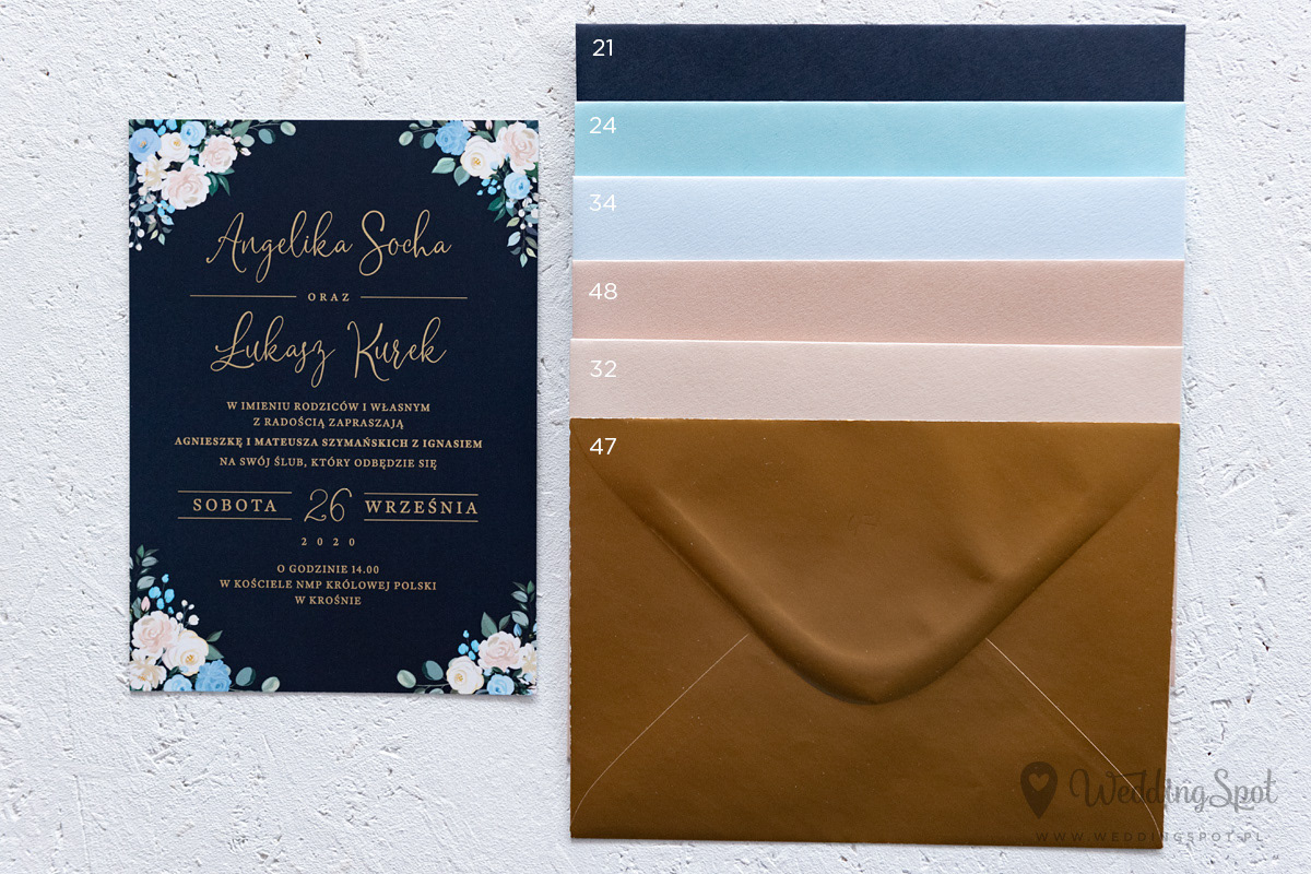 6,90 zł (od 176 szt.) 7,30 zł (101-175 szt.) 7,50 zł (76-100 szt.) 7,60 zł (50-75 szt.) W cenie: zaproszenie, koperta w wybranym kolorze, personalizacja nazwisk na zaproszeniach Opłata za wykonanie uszlachetnienia (niezależnie od ilości sztuk): 200 zł Złocona naklejka na kopertę: od 0,80 zł Wymiary zaproszenia: 11 x 15,4 cm Papier: biały matowy, gramatura 300 g/m2 Uszlachetnienie: obustronne złocenie, obustronna folia soft touch Istnieje możliwość modyfikacji wzoru oraz przesłania własnego tekstu do zaproszenia. Minimalne zamówienie: 50 sztuk Czas realizacji: do 10 dni roboczych