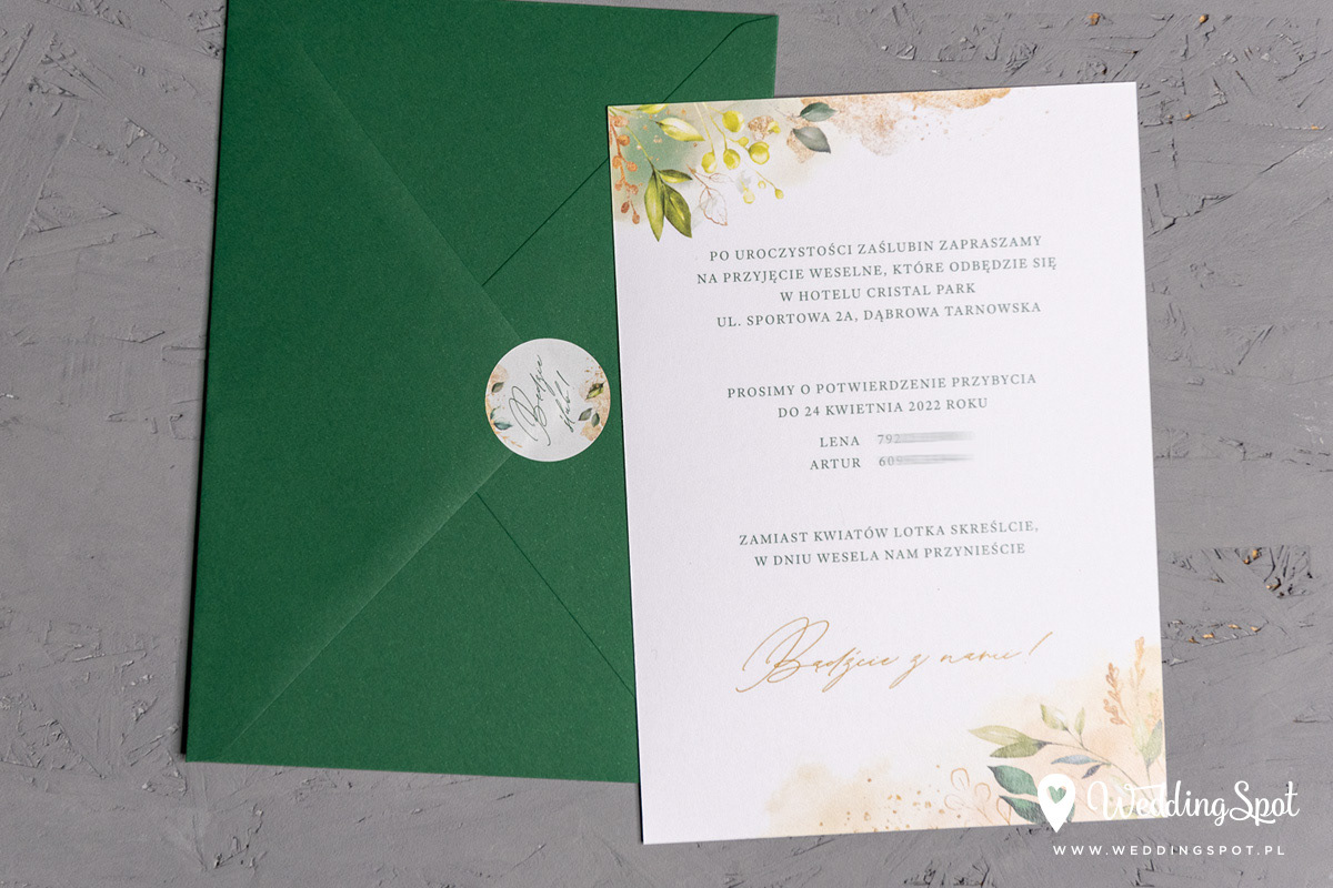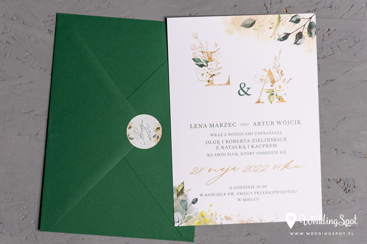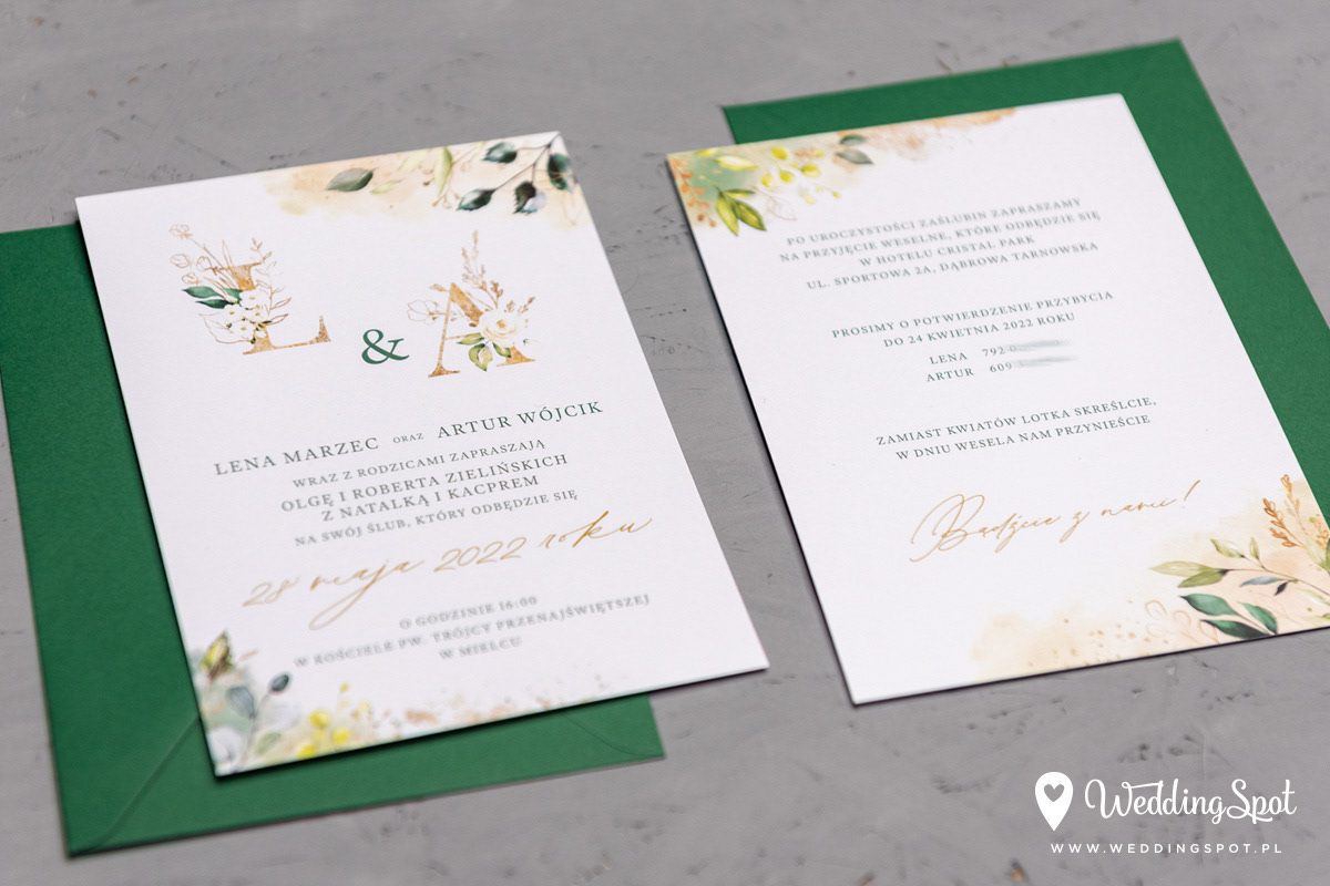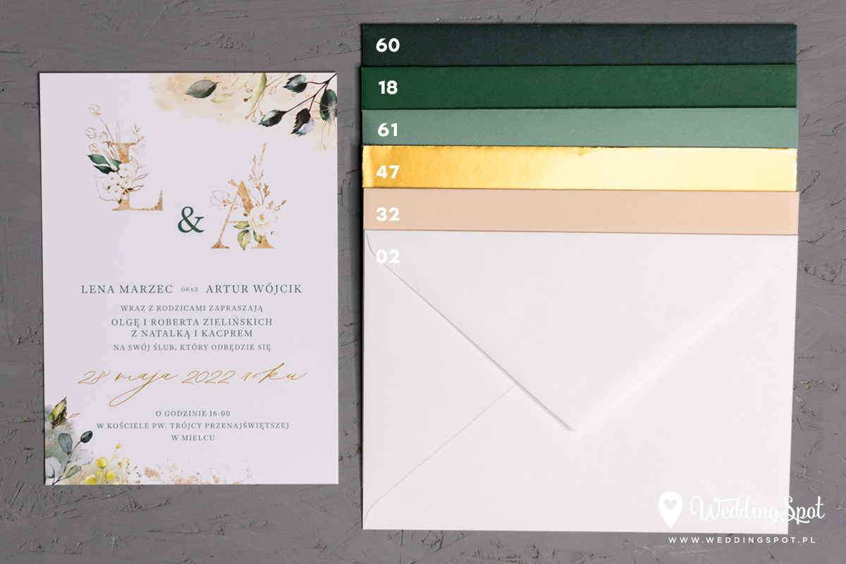 5,30 zł (od 176 szt.) 5,80 zł (101-175 szt.) 6,00 zł (76-100 szt.) 6,30 zł (50-75 szt.) W cenie: zaproszenie, koperta w wybranym kolorze, personalizacja nazwisk na zaproszeniach Naklejka na kopertę: od 0,60 zł Wymiary zaproszenia: 11 x 15,4 cm Papier: DNS - klasa premium, o podwyższonym współczynniku białości, gramatura 300 g/m2 Istnieje możliwość modyfikacji wzoru oraz przesłania własnego tekstu do zaproszenia. Minimalne zamówienie: 50 sztuk Czas realizacji: do 10 dni roboczych