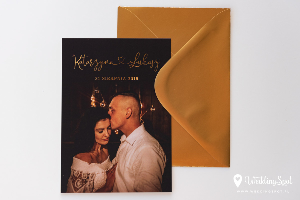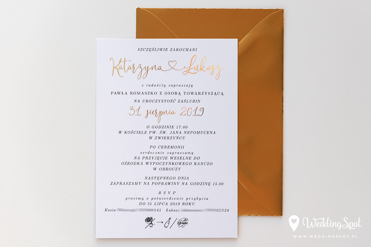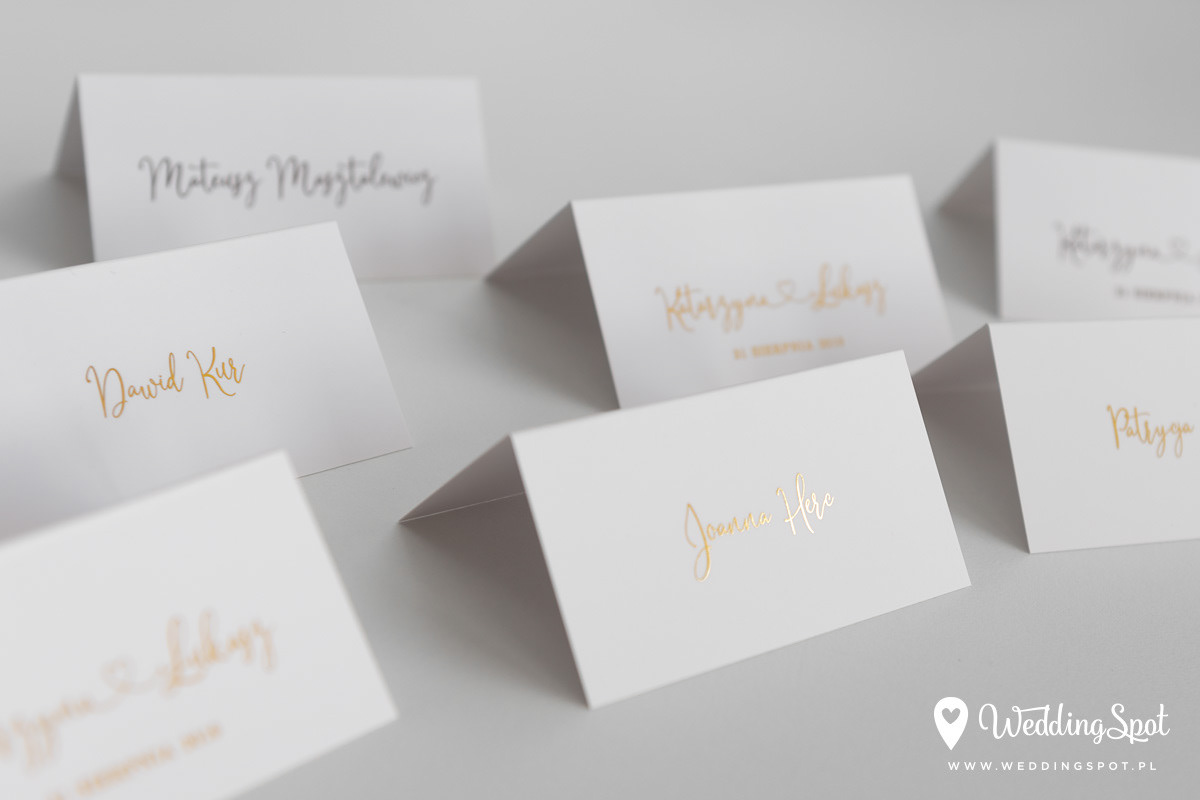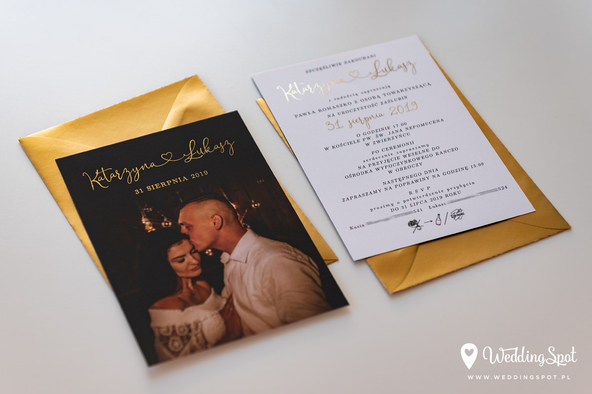 6,90 zł (od 176 szt.) 7,30 zł (101-175 szt.) 7,50 zł (76-100 szt.) 7,60 zł (50-75 szt.) W cenie: zaproszenie, koperta w wybranym kolorze, personalizacja nazwisk na zaproszeniach Opłata za wykonanie uszlachetnienia (niezależnie od ilości sztuk): 200 zł Złocona naklejka na kopertę: od 0,80 zł Wymiary zaproszenia: 11 x 15,4 cm Papier: biały matowy, gramatura 300 g/m2 Uszlachetnienie: obustronne złocenie, obustronna folia soft touch Istnieje możliwość modyfikacji wzoru oraz przesłania własnego tekstu do zaproszenia. Minimalne zamówienie: 50 sztuk Czas realizacji: do 10 dni roboczych