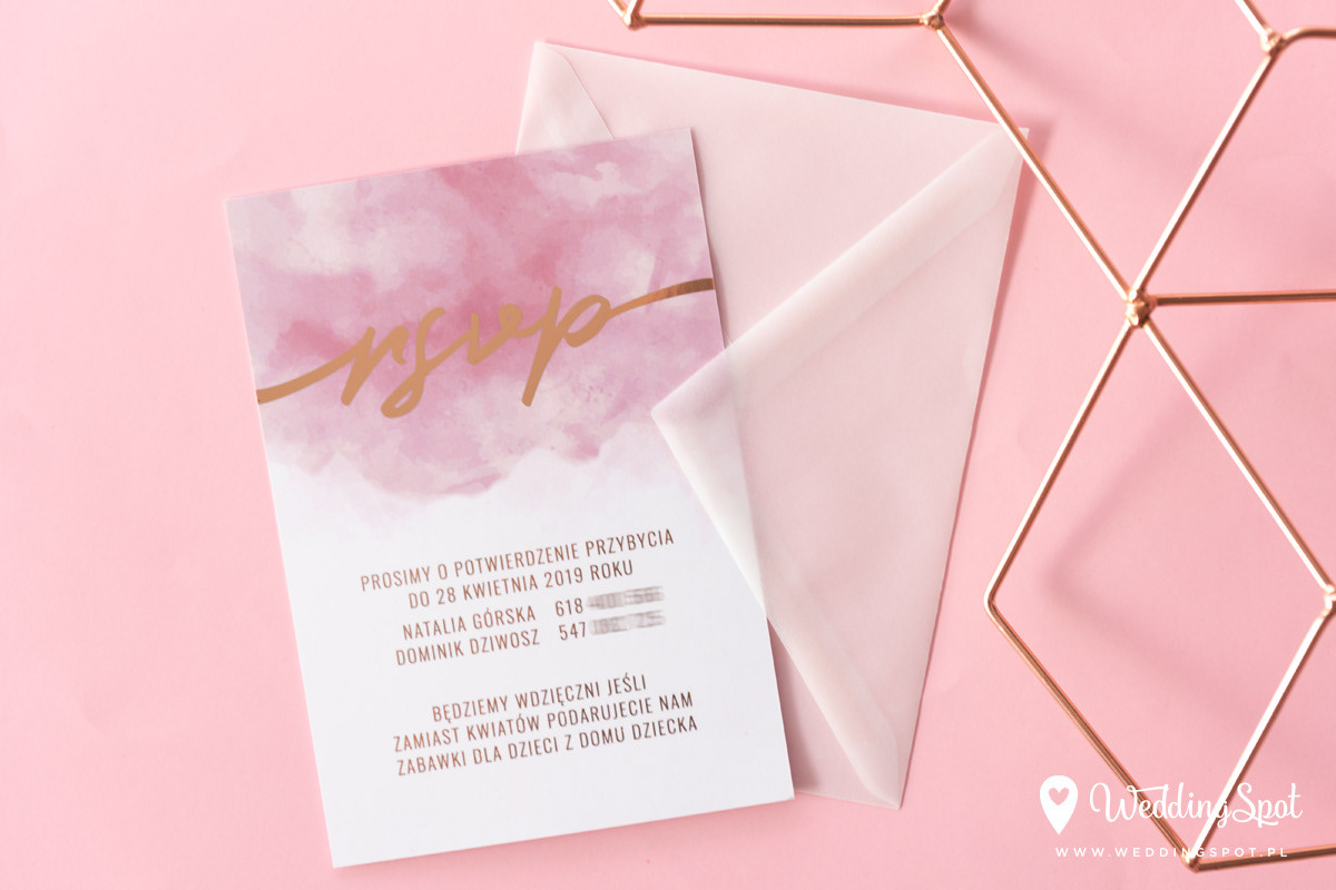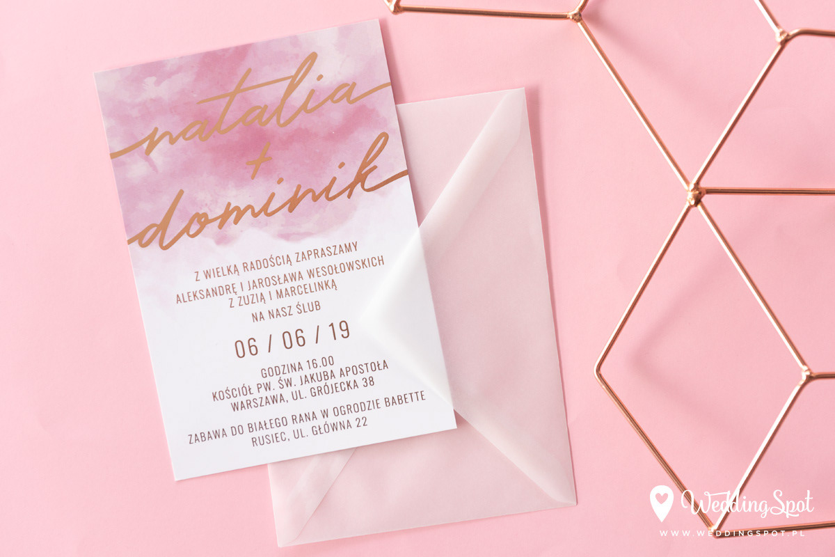 7,20 zł (od 176 szt.) 7,60 zł (101-175 szt.) 7,80 zł (76-100 szt.) 7,90 zł (50-75 szt.) W cenie: zaproszenie, koperta w wybranym kolorze, personalizacja nazwisk na zaproszeniach Opłata za wykonanie uszlachetnienia (niezależnie od ilości sztuk): 200 zł Naklejka rose gold na kopertę: od 0,80 zł Wymiary zaproszenia: 11 x 15,4 cm Papier: biały matowy, gramatura 300 g/m2 Uszlachetnienie: obustronna folia rose gold, obustronna folia soft touch Istnieje możliwość modyfikacji wzoru oraz przesłania własnego tekstu do zaproszenia. Minimalne zamówienie: 50 sztuk Czas realizacji: do 10 dni roboczych