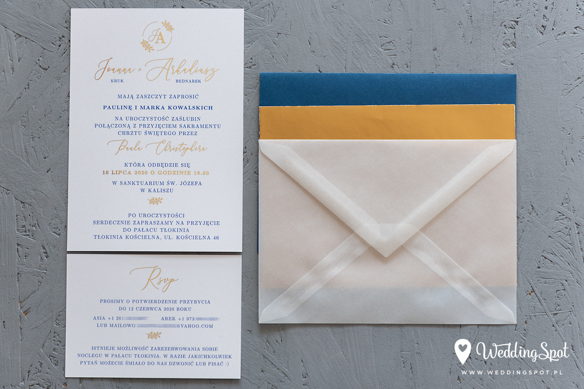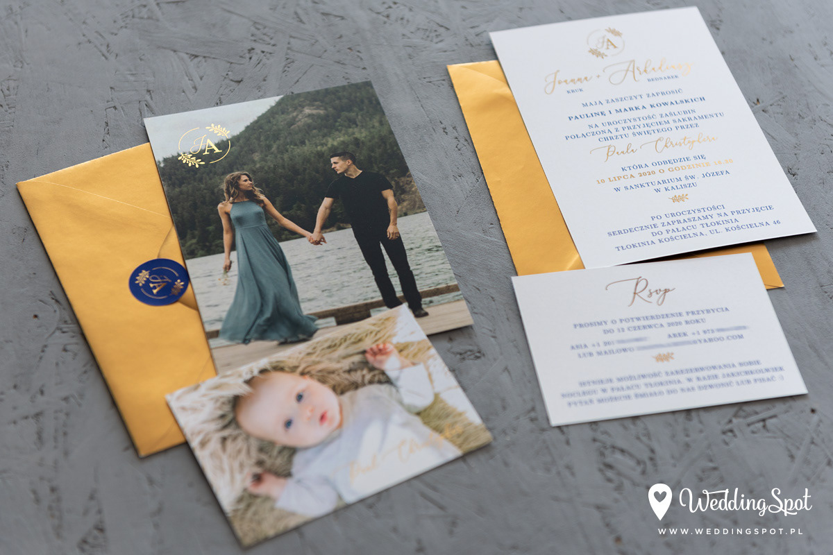 8,90 zł (od 176 szt.) 9,40 zł (101-175 szt.) 9,70 zł (76-100 szt.) 9,90 zł (50-75 szt.) W cenie: zaproszenie, karta RSVP, koperta w wybranym kolorze, personalizacja nazwisk na zaproszeniach Opłata za wykonanie uszlachetnienia (niezależnie od ilości sztuk): 200 zł Złocona naklejka na zamknięcie koperty: od 0,80 zł Wymiary zaproszenia: 11 x 15,4 cm Wymiary karty RSVP: 11 x 7,7 cm Papier: biały matowy, gramatura 300 g/m2 Uszlachetnienie: obustronne złocenie, obustronna folia soft touch Istnieje możliwość modyfikacji wzoru oraz przesłania własnego tekstu do zaproszenia. Minimalne zamówienie: 50 sztuk Czas realizacji: do 10 dni roboczych