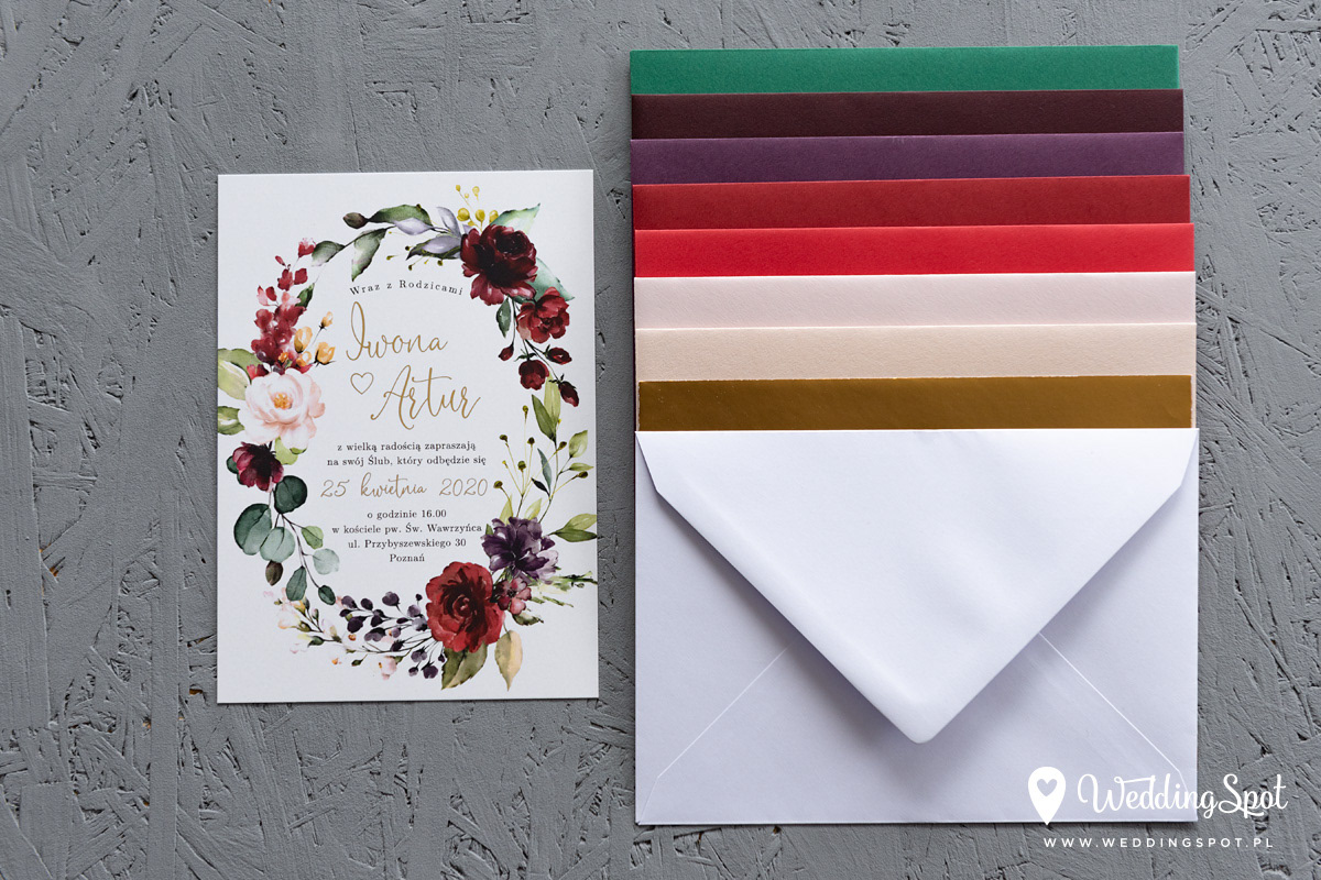 6,40 zł (od 176 szt.) 6,80 zł (101-175 szt.) 7,00 zł (76-100 szt.) 7,10 zł (50-75 szt.) W cenie: zaproszenie, koperta w wybranym kolorze Opłata za wykonanie uszlachetnienia (niezależnie od ilości sztuk): 200 zł Złocona naklejka na kopertę: od 0,80 zł Personalizacja koperty: 2 zł Wymiary zaproszenia: 11 x 15,4 cm Papier: biały matowy, gramatura 300 g/m2 Uszlachetnienie: obustronne złocenie, obustronna folia soft touch Istnieje możliwość modyfikacji wzoru oraz przesłania własnego tekstu do zaproszenia. Minimalne zamówienie: 50 sztuk Czas realizacji: do 10 dni roboczych