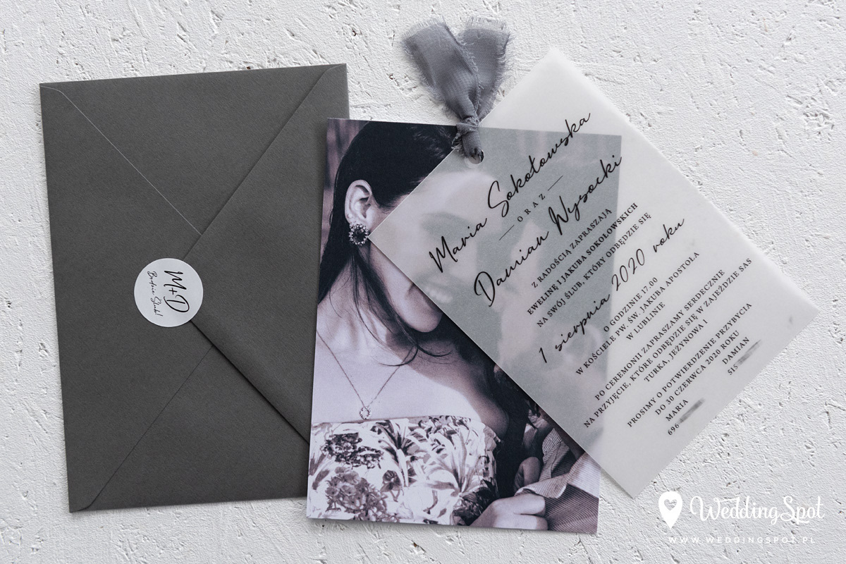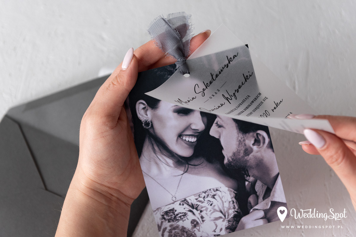 7,40 zł (od 176 szt.) 7,90 zł (101-175 szt.) 8,10 zł (76-100 szt.) 8,30 zł (50-75 szt.) W cenie: zaproszenie z kalki, karta ze zdjęciem, szyfonowa ręcznie rwana wstążka, koperta w wybranym kolorze, personalizacja nazwisk na zaproszeniach Naklejka na zamknięcie koperty: od 0,60 zł Zaproszenie można zamówić również z wstążką satynową zamiast szyfonowej w poniższych cenach: 6,90 zł (od 176 szt.) 7,40 zł (101-175 szt.) 7,60 zł (76-100 szt.) 7,70 zł (50-75 szt.) Wymiary zaproszenia: 11 x 15 cm Papier: DNS - klasa premium, o podwyższonym współczynniku białości, gramatura 300 g/m2 Gramatura kalki: 160 g/m2 Istnieje możliwość modyfikacji wzoru oraz przesłania własnego tekstu do zaproszenia. Minimalne zamówienie: 50 sztuk Czas realizacji: do 10 dni roboczych
