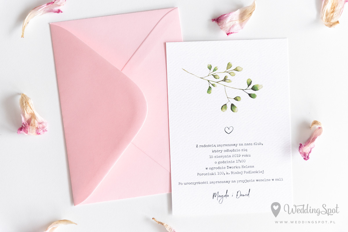 5,30 zł (od 176 szt.) 5,80 zł (101-175 szt.) 6,00 zł (76-100 szt.) 6,30 zł (50-75 szt.) W cenie: zaproszenie, koperta w wybranym kolorze, personalizacja nazwisk na zaproszeniach Naklejka na kopertę: od 0,60 zł Wymiary zaproszenia: 11 x 15,4 cm Papier: DNS - klasa premium, o podwyższonym współczynniku białości, gramatura 300 g/m2 Istnieje możliwość modyfikacji wzoru oraz przesłania własnego tekstu do zaproszenia. Minimalne zamówienie: 50 sztuk Czas realizacji: do 10 dni roboczych