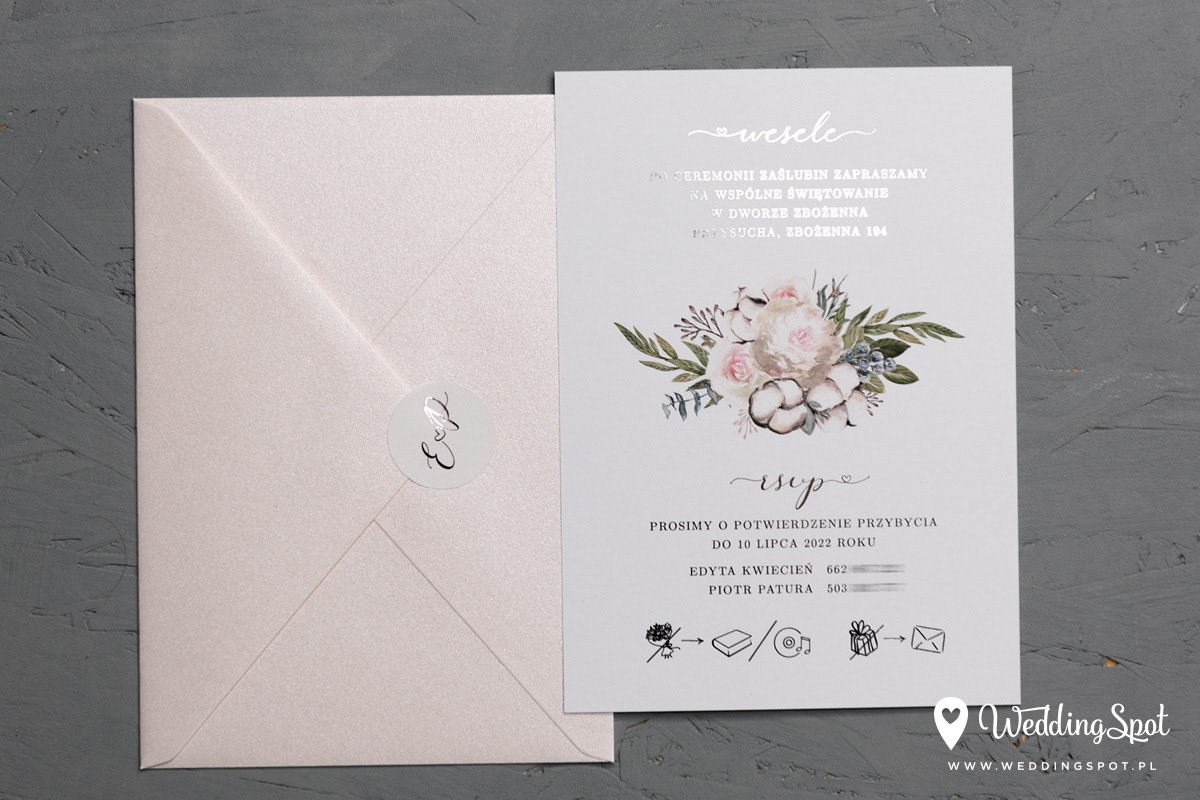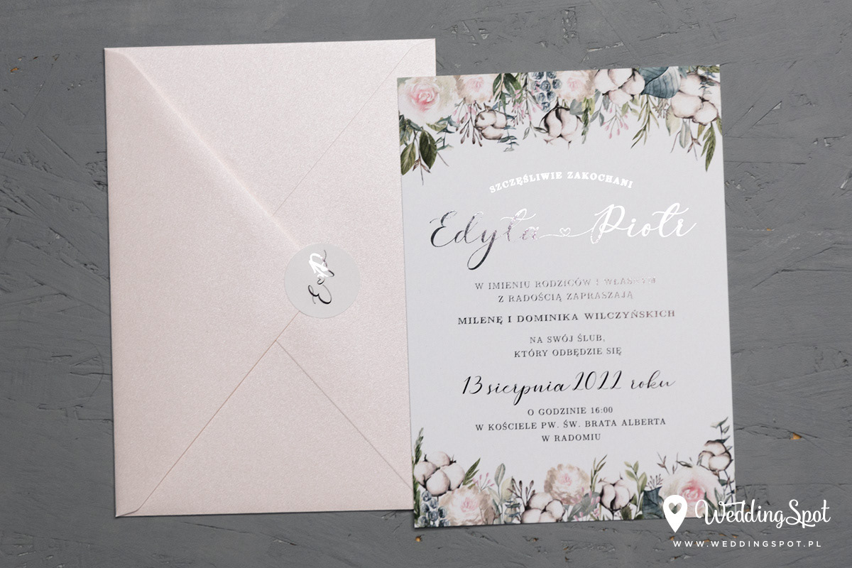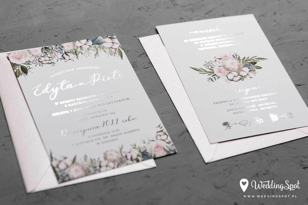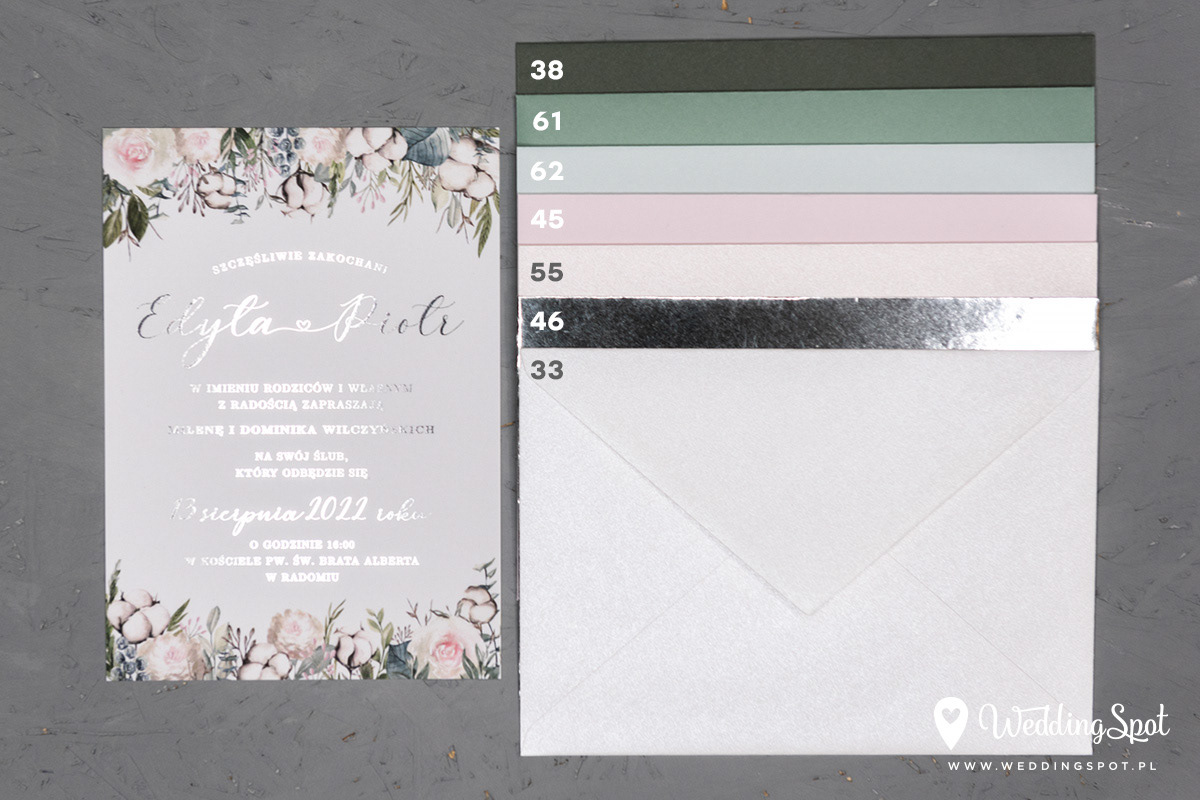 6,90 zł (od 176 szt.) 7,30 zł (101-175 szt.) 7,50 zł (76-100 szt.) 7,60 zł (50-75 szt.) W cenie: zaproszenie, koperta w wybranym kolorze, personalizacja nazwisk na zaproszeniach Opłata za wykonanie uszlachetnienia (niezależnie od ilości sztuk): 200 zł Srebrzona naklejka na kopertę: od 0,80 zł Wymiary zaproszenia: 11 x 15,4 cm Papier: biały matowy, gramatura 300 g/m2 Uszlachetnienie: obustronne srebrzenie, obustronna folia soft touch Istnieje możliwość modyfikacji wzoru oraz przesłania własnego tekstu do zaproszenia. Minimalne zamówienie: 50 sztuk Czas realizacji: do 10 dni roboczych