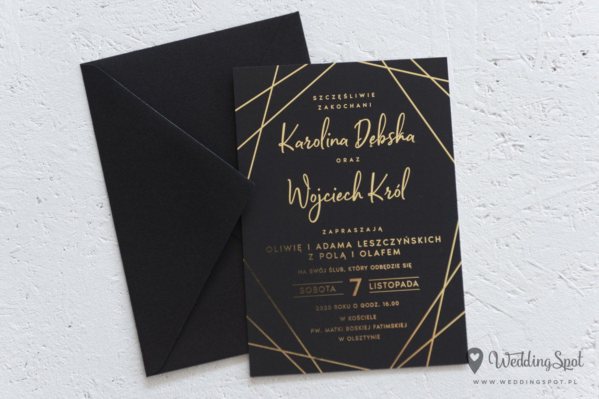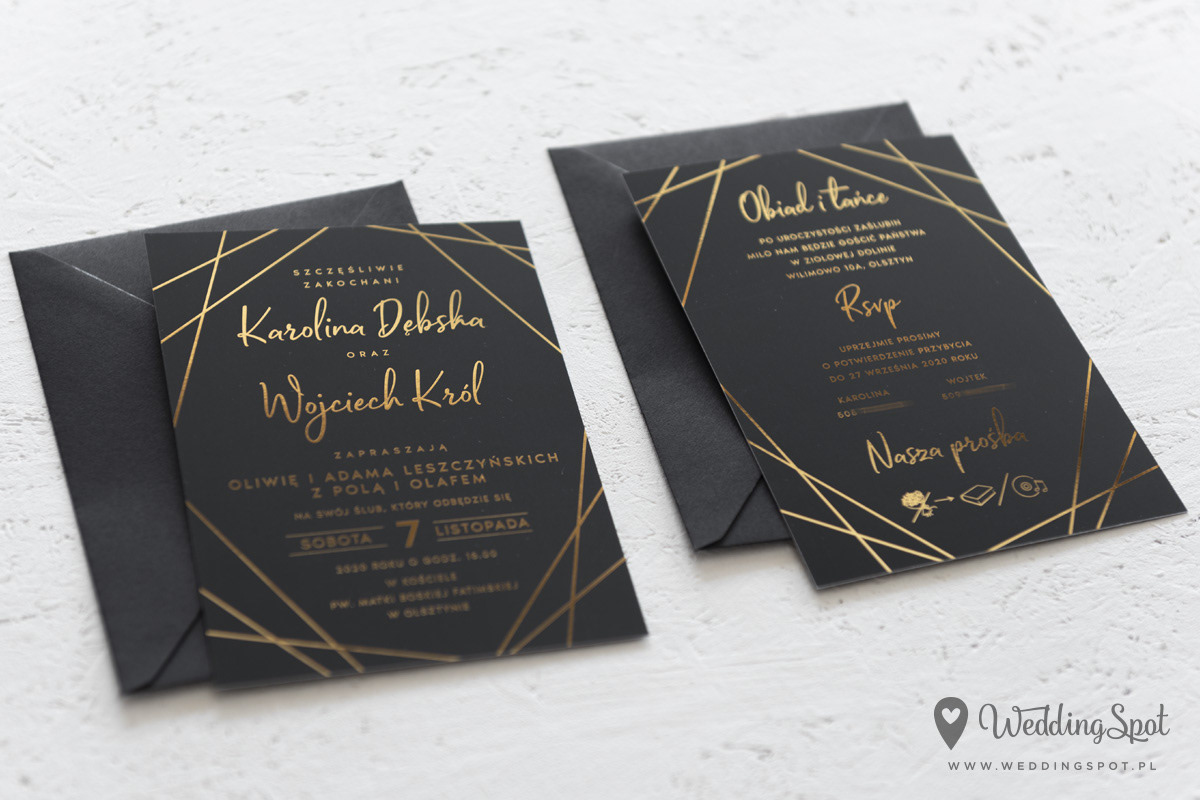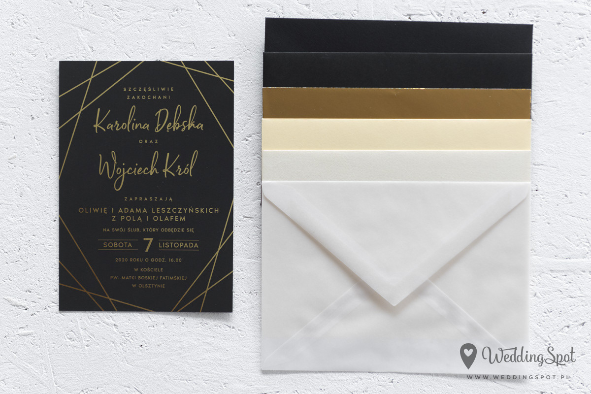 6,90 zł (od 176 szt.) 7,30 zł (101-175 szt.) 7,50 zł (76-100 szt.) 7,60 zł (50-75 szt.) W cenie: zaproszenie, koperta w wybranym kolorze, personalizacja nazwisk na zaproszeniach Opłata za wykonanie uszlachetnienia (niezależnie od ilości sztuk): 200 zł Złocona naklejka na kopertę: od 0,80 zł Wymiary zaproszenia: 11 x 15,4 cm Papier: biały matowy, gramatura 300 g/m2 Uszlachetnienie: obustronne złocenie, obustronna folia soft touch Istnieje możliwość modyfikacji wzoru oraz przesłania własnego tekstu do zaproszenia. Minimalne zamówienie: 50 sztuk Czas realizacji: do 10 dni roboczych