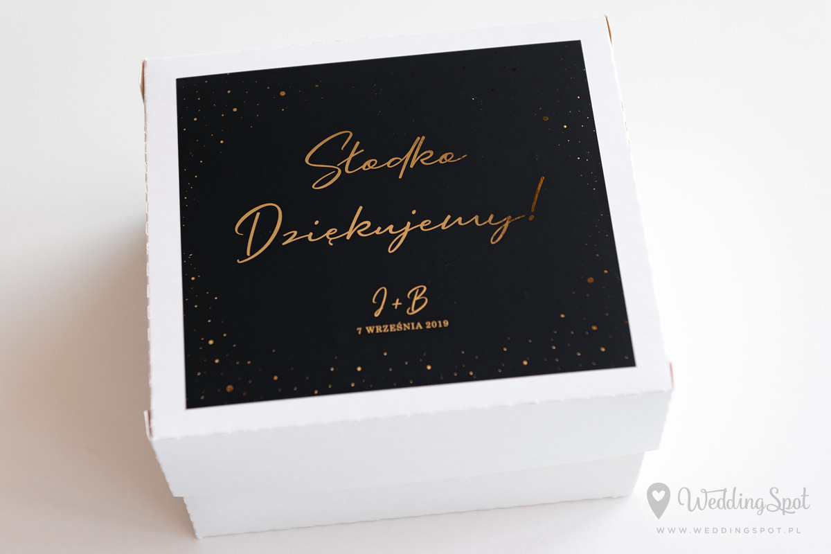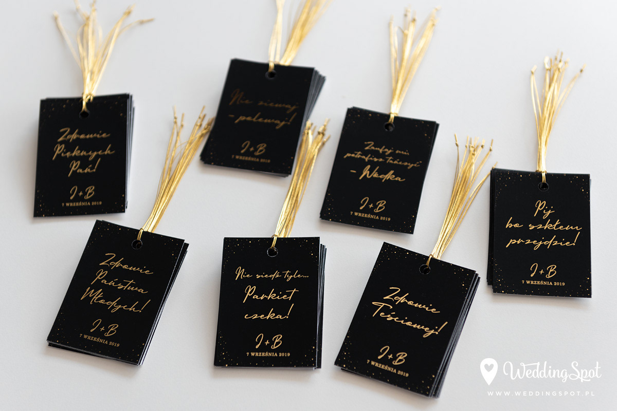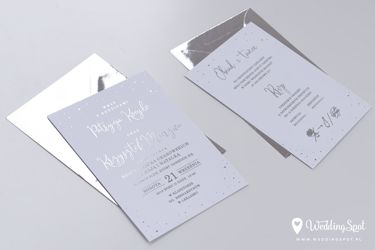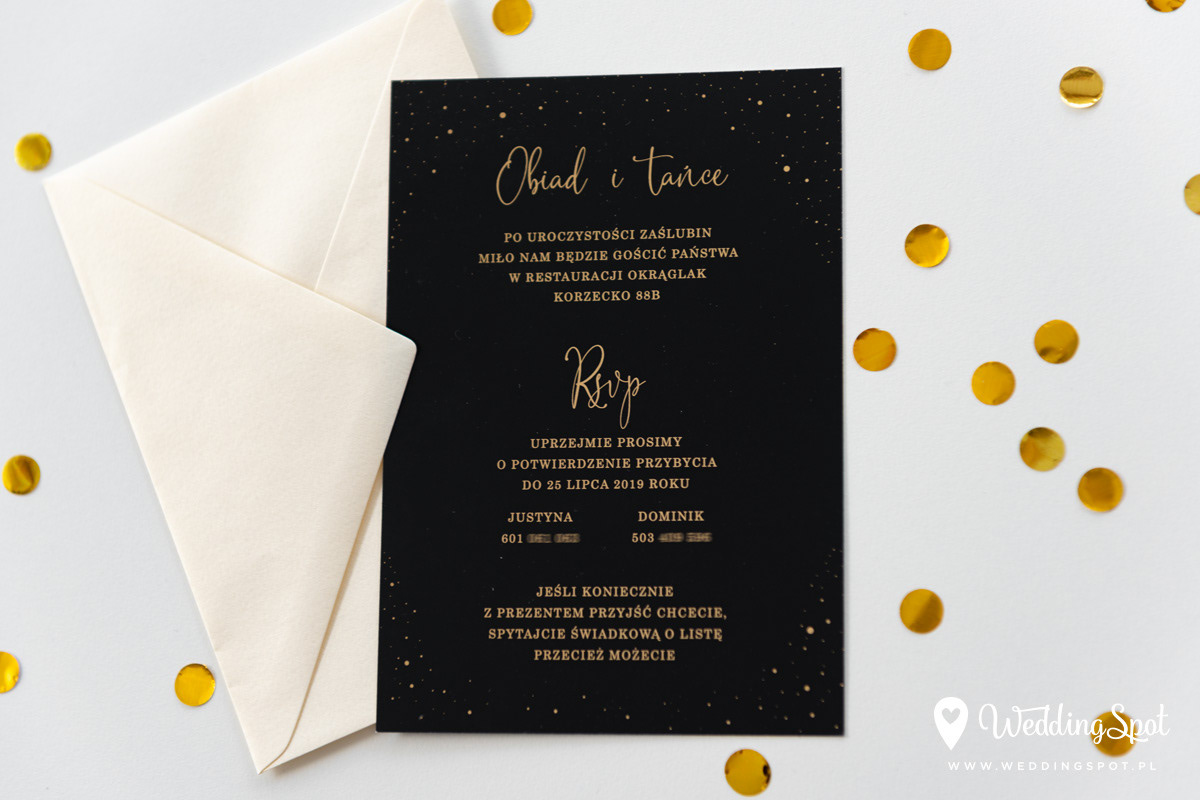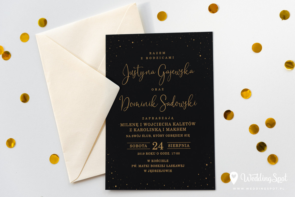6,90 zł (od 176 szt.) 7,30 zł (101-175 szt.) 7,50 zł (76-100 szt.) 7,60 zł (50-75 szt.) W cenie: zaproszenie, koperta w wybranym kolorze, personalizacja nazwisk na zaproszeniach Opłata za wykonanie uszlachetnienia (niezależnie od ilości sztuk): 200 zł Złocona naklejka na kopertę: od 0,80 zł Wymiary zaproszenia: 11 x 15,4 cm Papier: biały matowy, gramatura 300 g/m2 Uszlachetnienie: obustronne złocenie, obustronna folia soft touch Istnieje możliwość modyfikacji wzoru oraz przesłania własnego tekstu do zaproszenia. Minimalne zamówienie: 50 sztuk Czas realizacji: do 10 dni roboczych