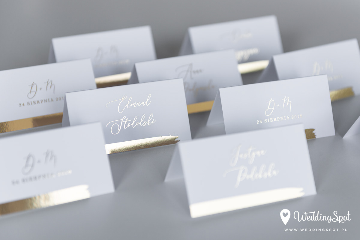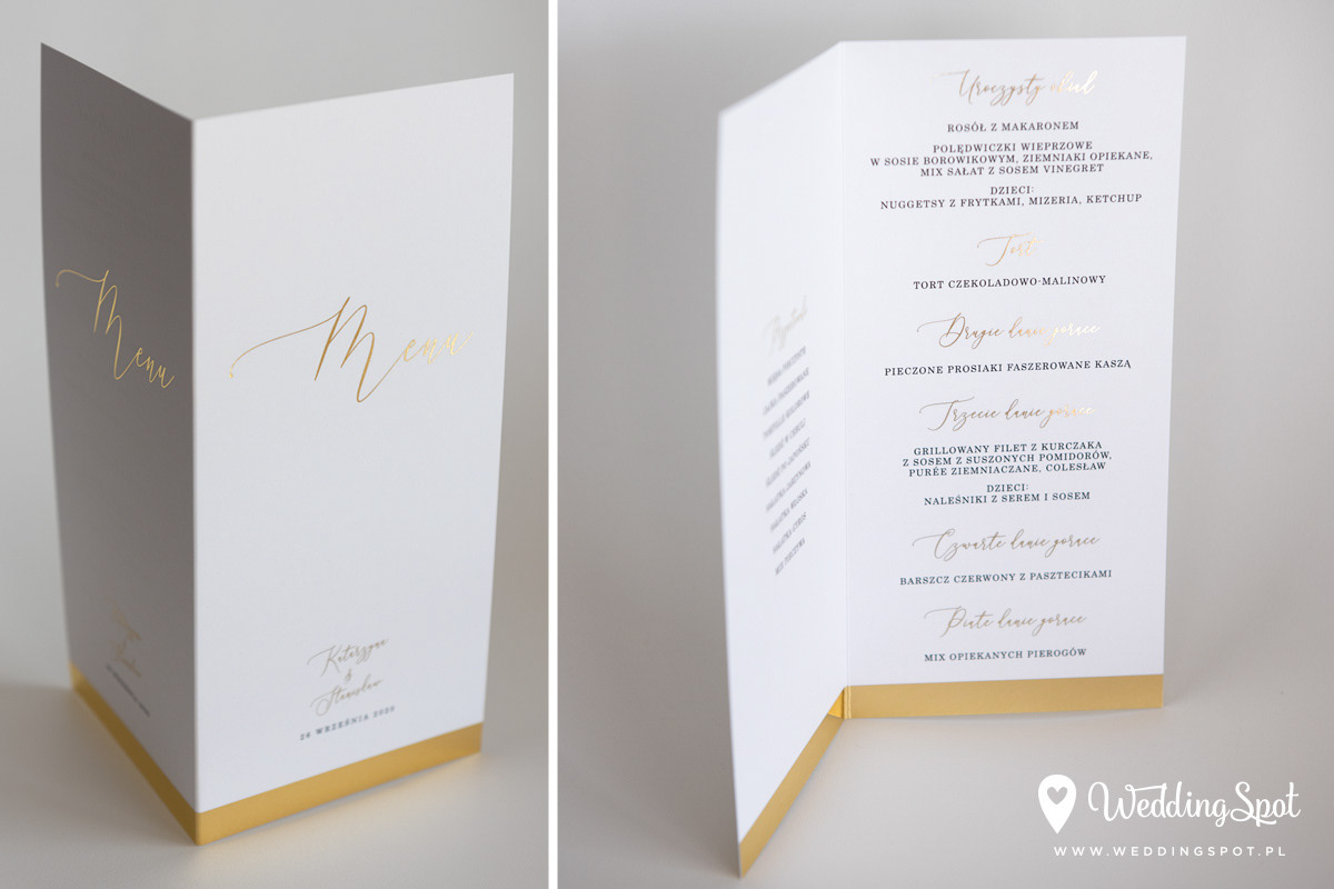6,90 zł (od 176 szt.) 7,30 zł (101-175 szt.) 7,50 zł (76-100 szt.) 7,60 zł (50-75 szt.) W cenie: zaproszenie, koperta w wybranym kolorze, personalizacja nazwisk na zaproszeniach Opłata za wykonanie uszlachetnienia (niezależnie od ilości sztuk): 200 zł Złocona naklejka na kopertę: od 0,80 zł Wymiary zaproszenia: 11 x 15,4 cm Papier: biały matowy, gramatura 300 g/m2 Uszlachetnienie: obustronne złocenie, obustronna folia soft touch Istnieje możliwość modyfikacji wzoru oraz przesłania własnego tekstu do zaproszenia. Minimalne zamówienie: 50 sztuk Czas realizacji: do 10 dni roboczych